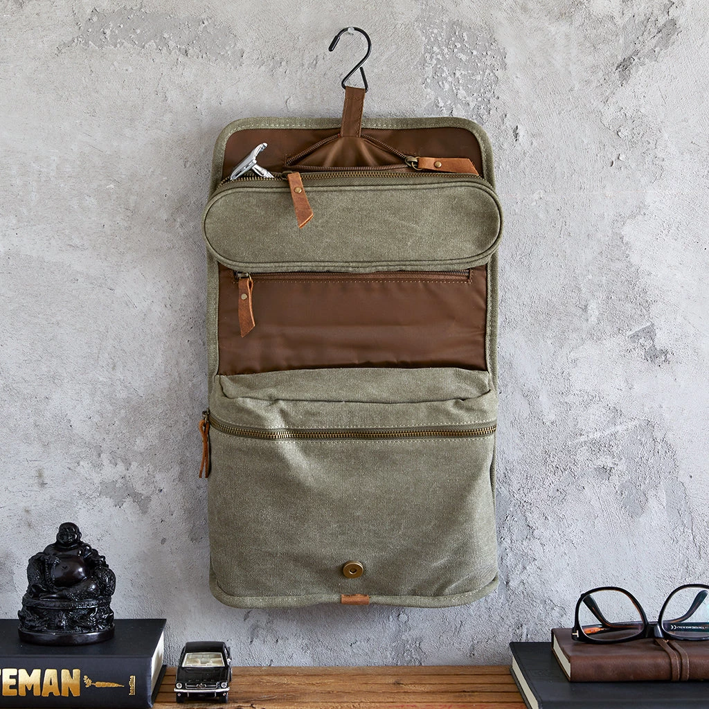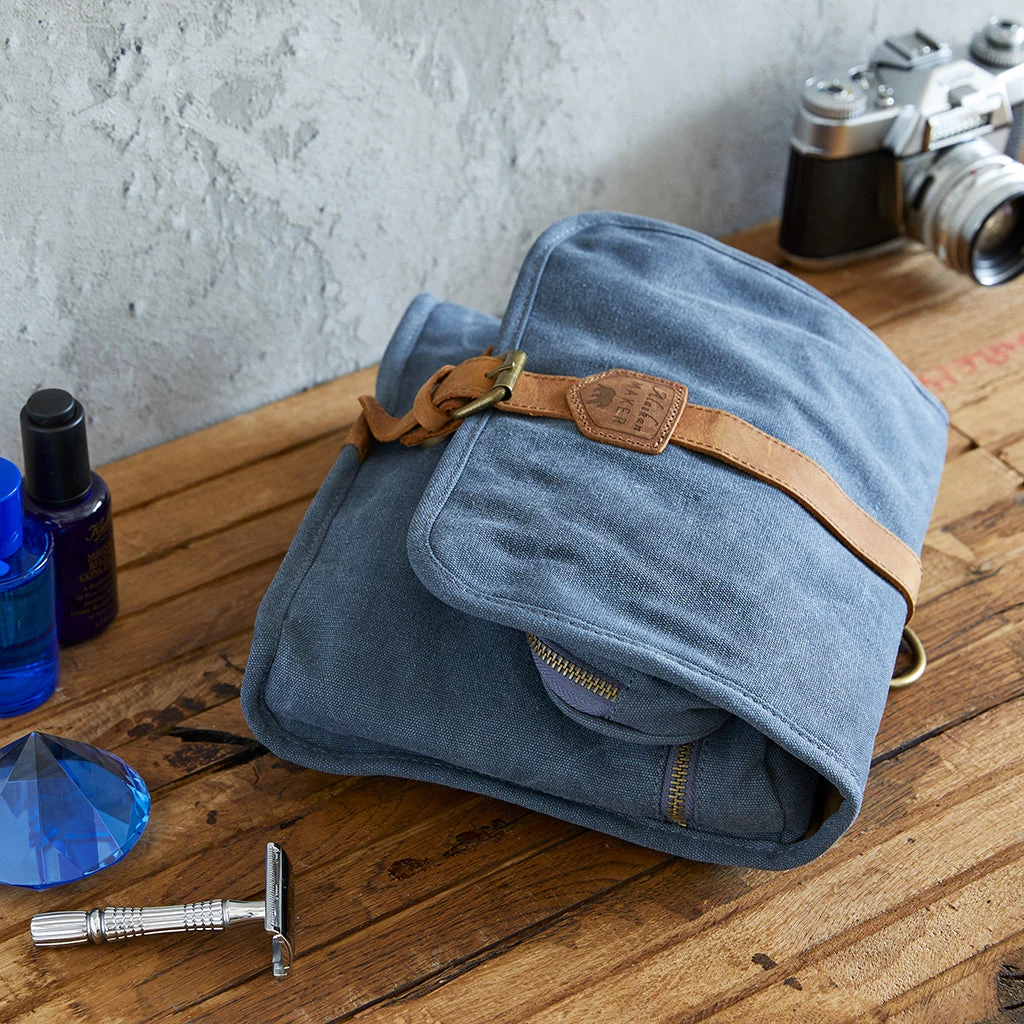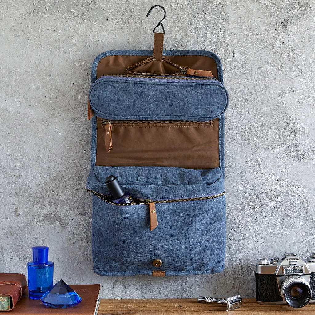 An attractive hanging toiletry bag. Closed with a chunky leather strap and buckle which is actually attached to a magnetic clip clasp for quick opening, the three zipped inner compartments can be easily accessed when hanging from the hook in a bathroom or changing room. The hook is zipped away when travelling in a top pocket so it won’t catch on clothes etc. in the suitcase.