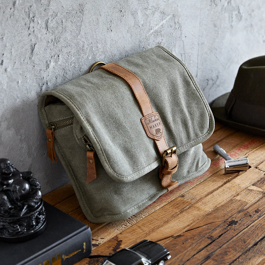 The exterior is a robust canvas treated against water and stains with a  vegetable-tanned leather strap. The lining is 100% nylon.