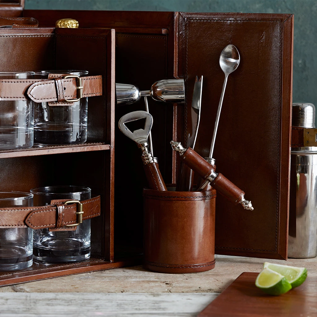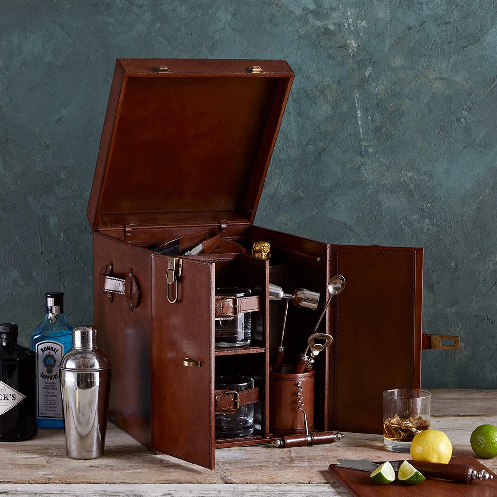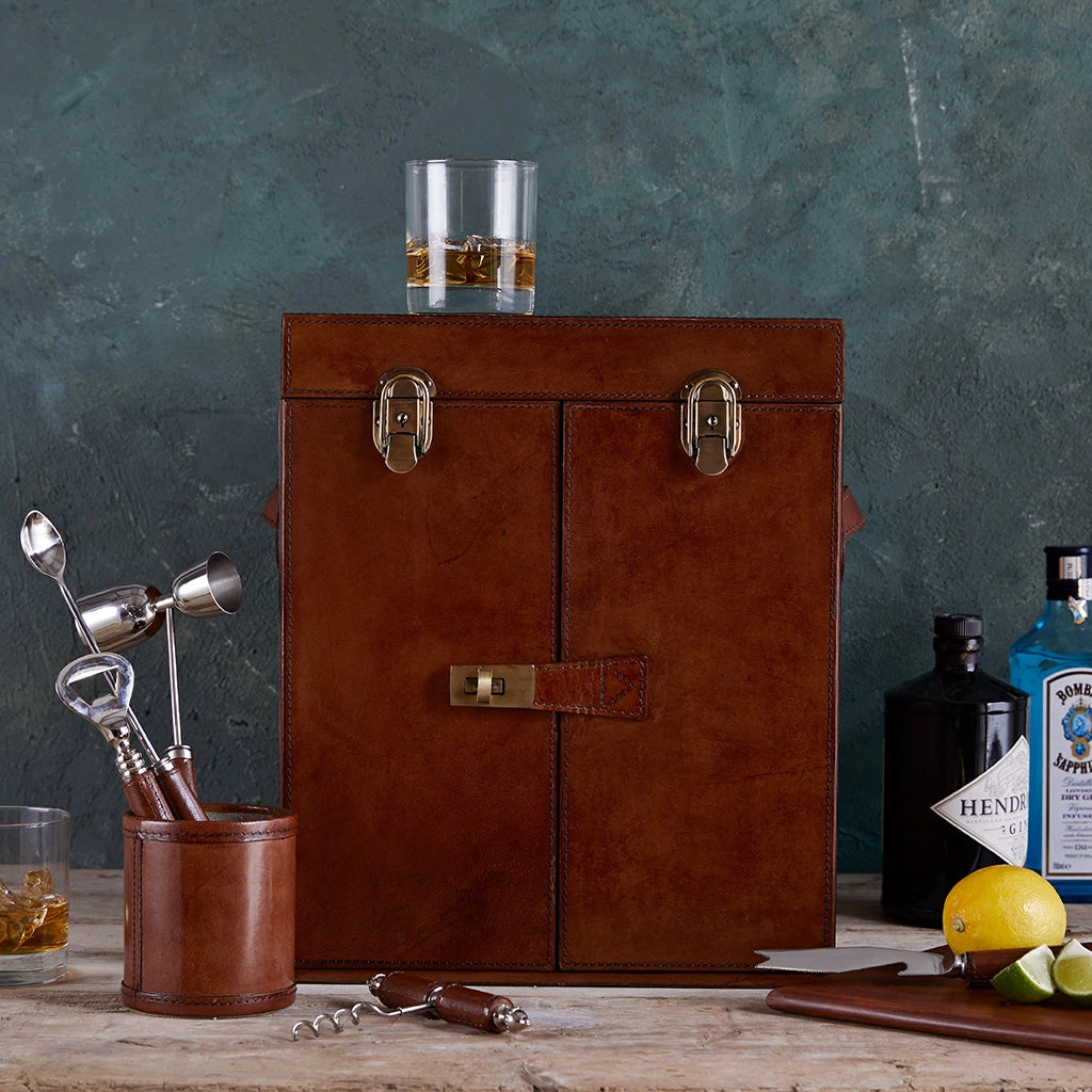 The leather mixology box is the definitive set for any discerning cocktail enthusiast. There are three compartments to hold champagne, wine and most standard spirit bottles, bar tools in a pot and cocktail shaker.