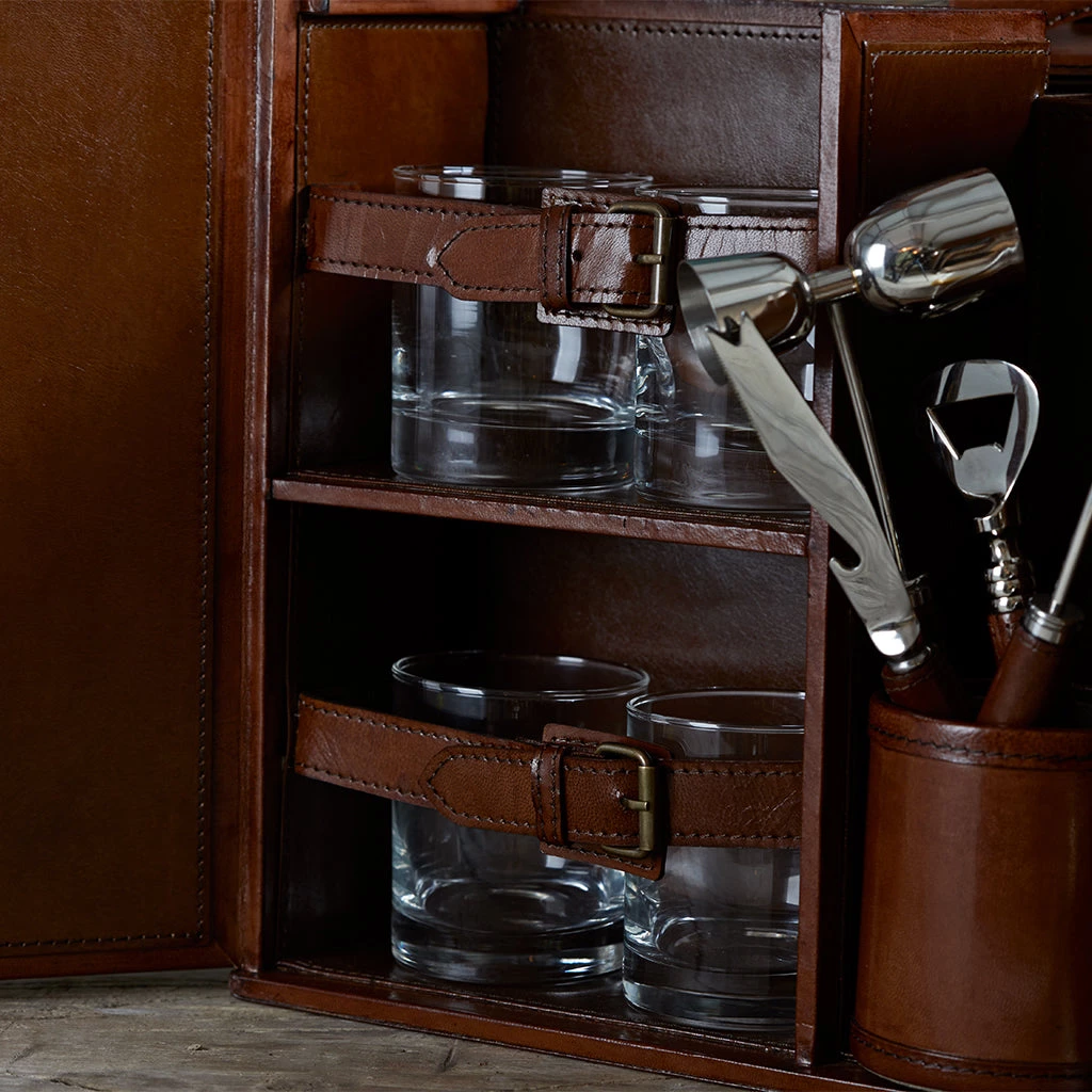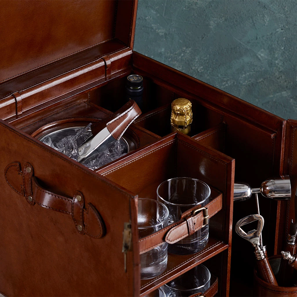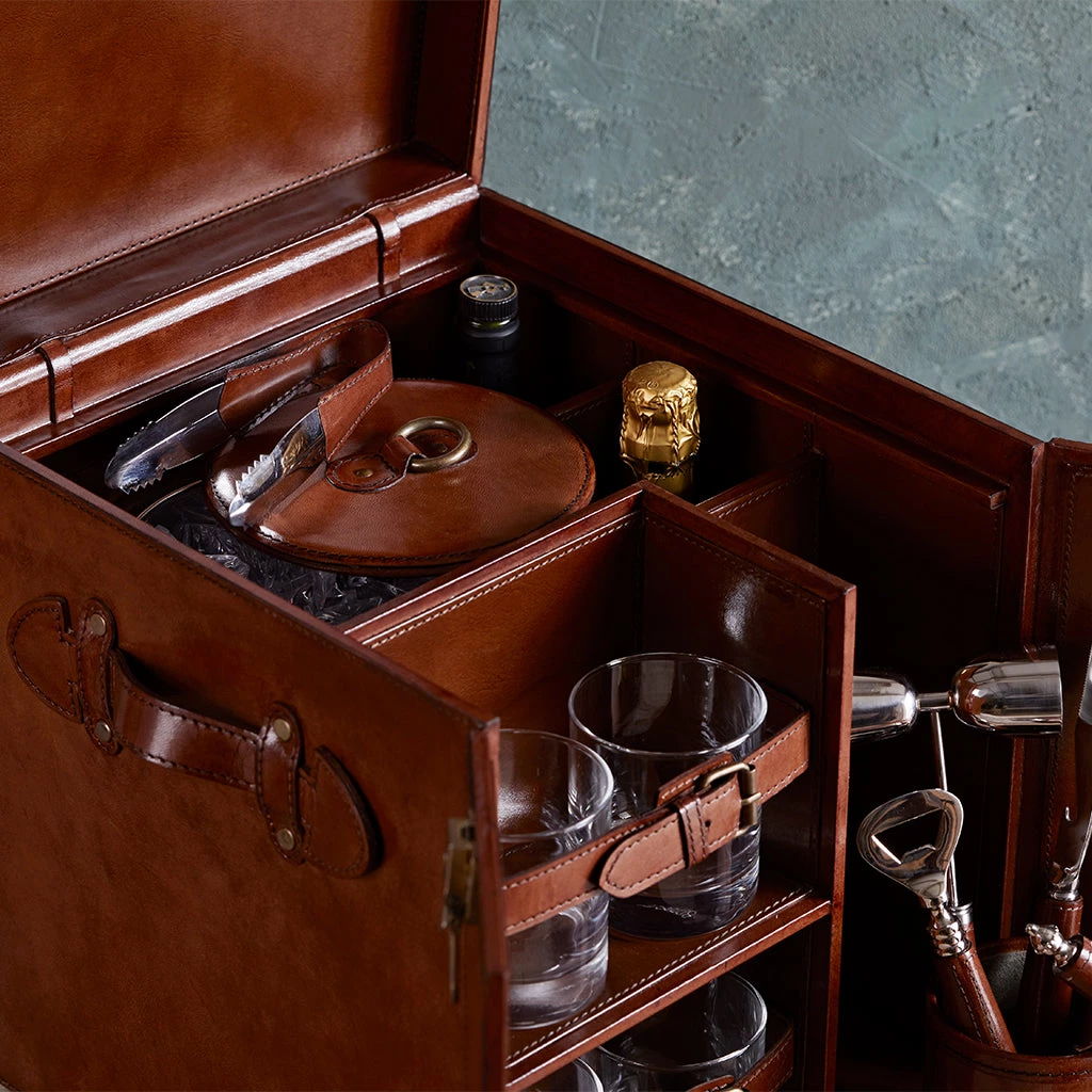 The leather mixology box is the definitive set for any discerning cocktail enthusiast. There are three compartments to hold champagne, wine and most standard spirit bottles, bar tools in a pot and cocktail shaker.
