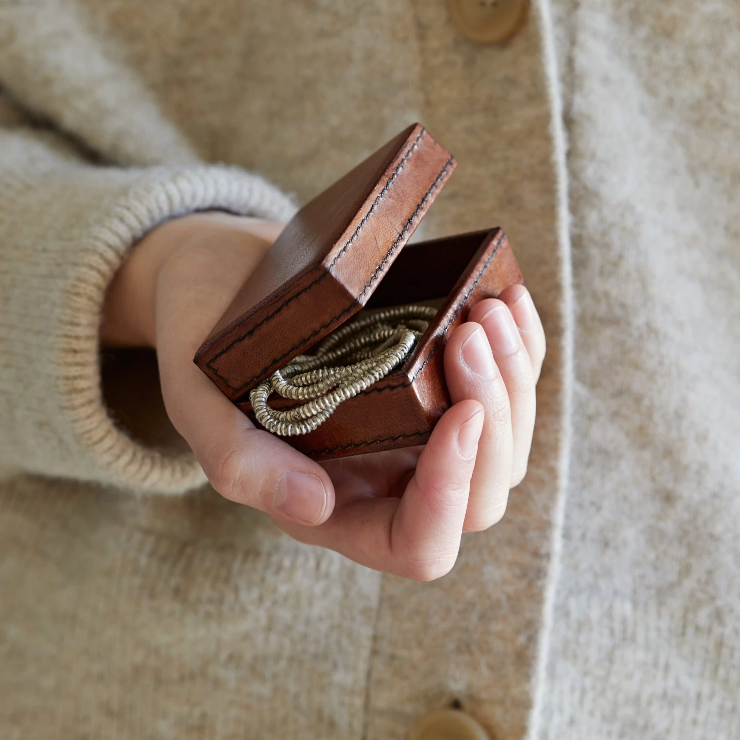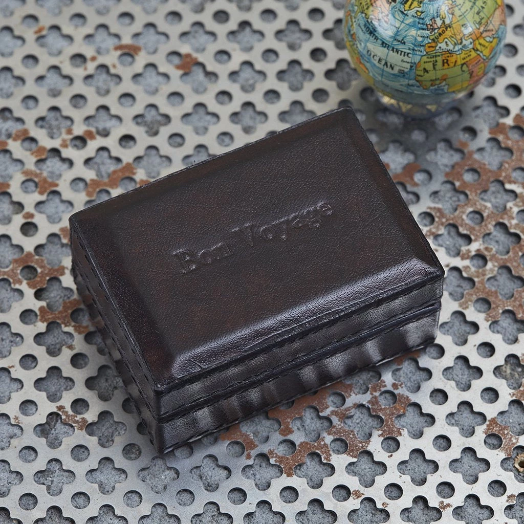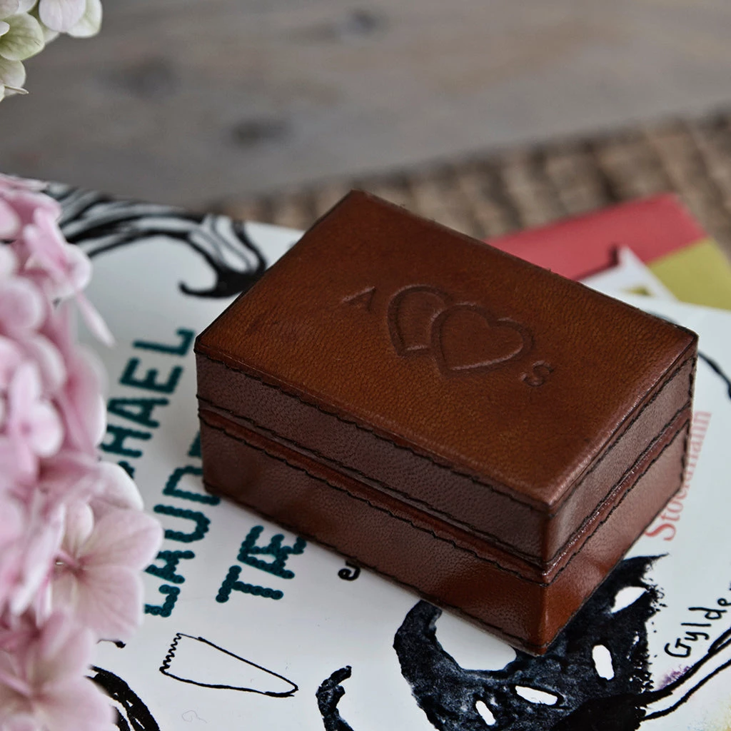 A leather mini box suitable for earrings, studs, and cufflinks. A nice size for a gap year student to take along in a rucksack or when away for the weekend to keep trinkets together.