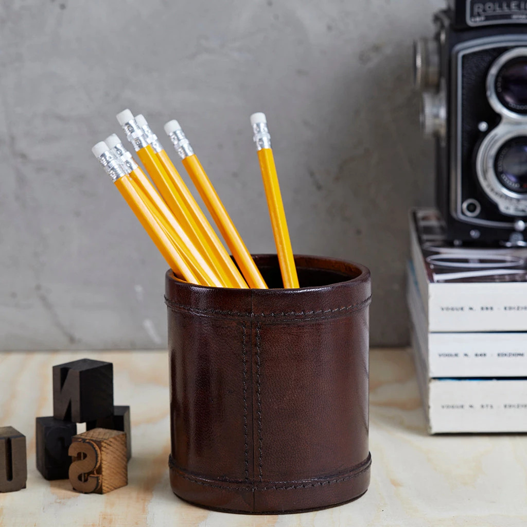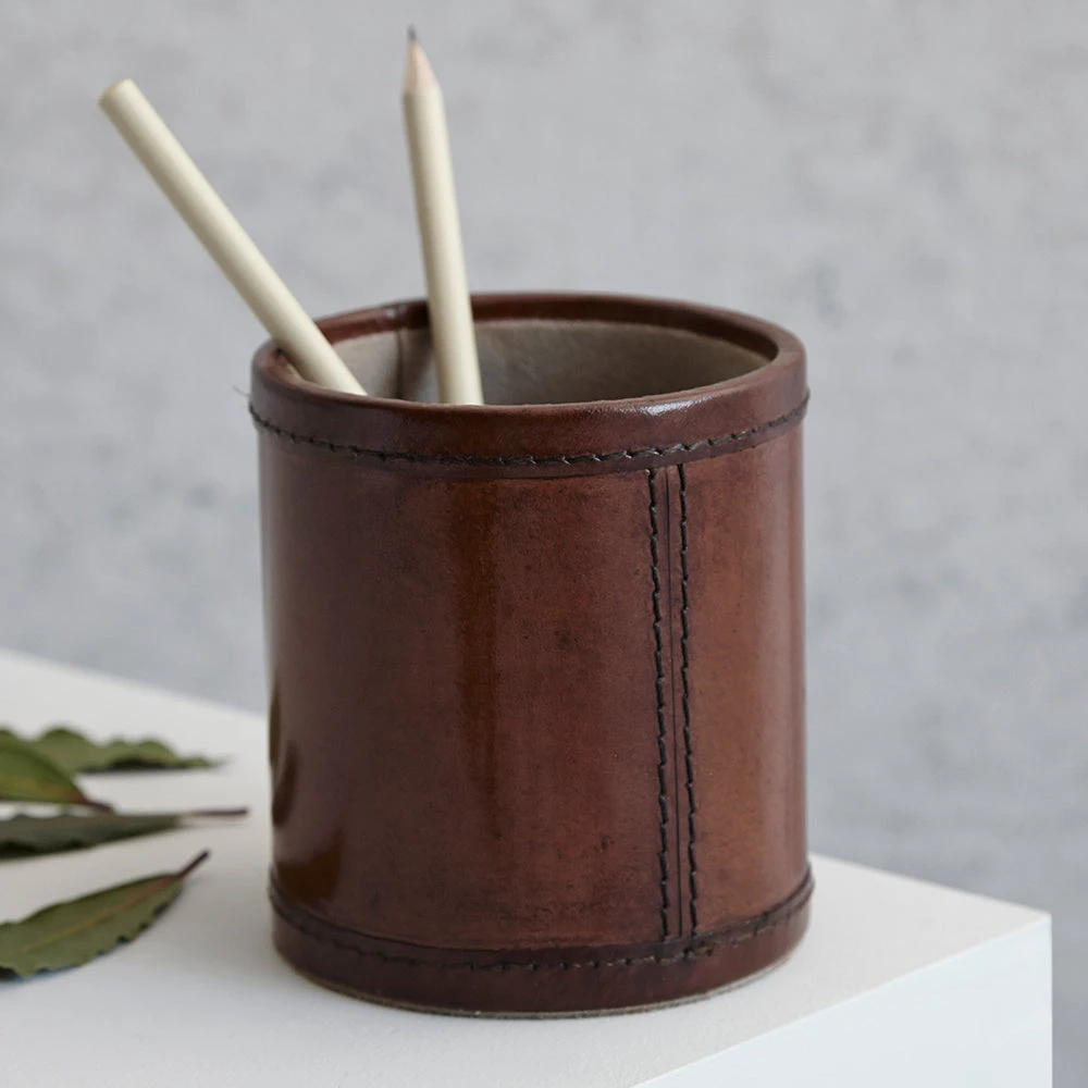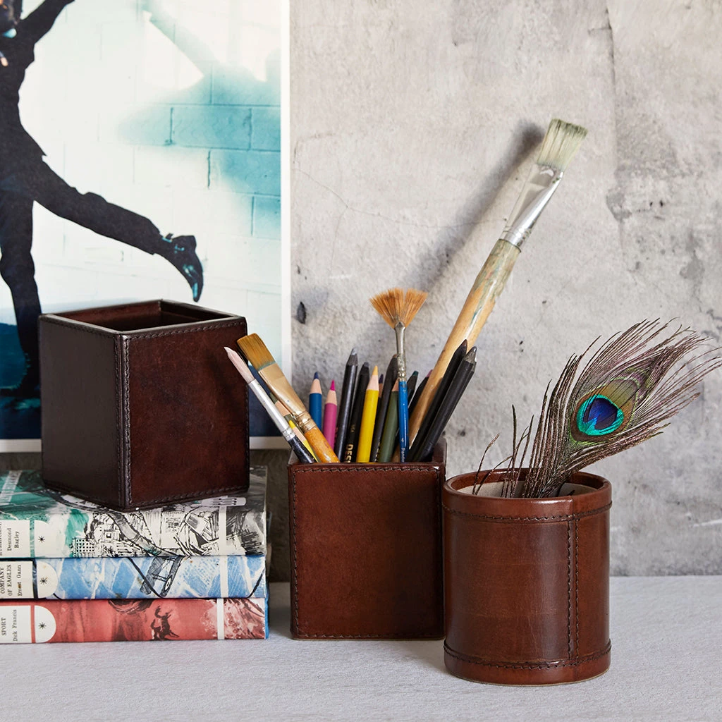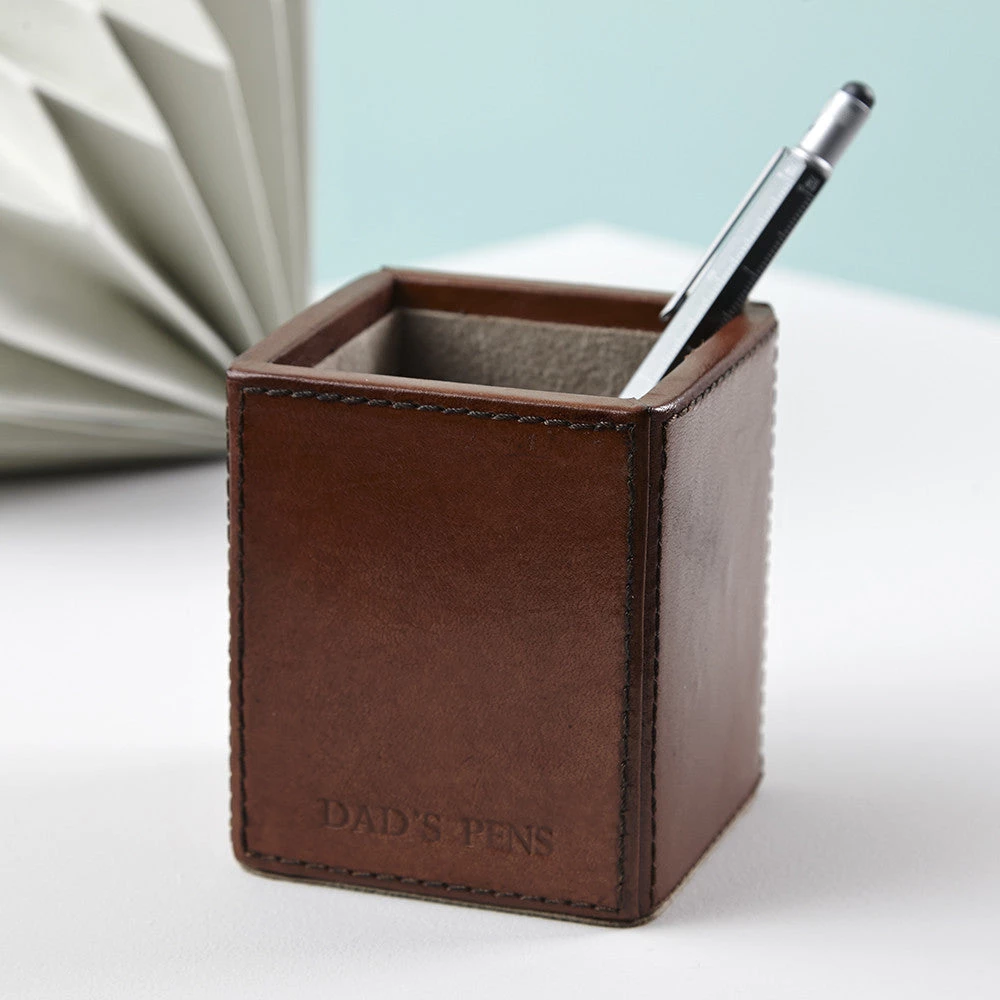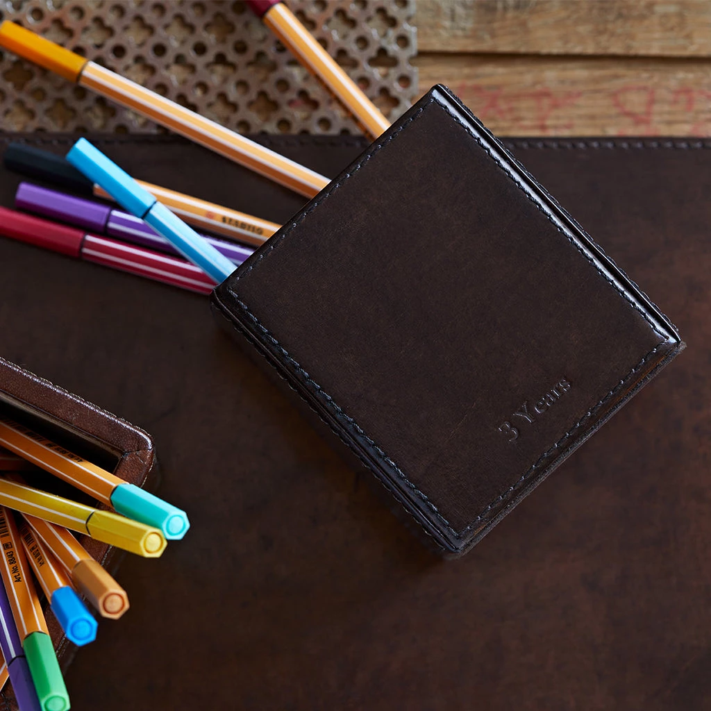 Available in a square or a round shape. Please note that we can only emboss the square leather pen pot centralised near the base (see photo). Add a business card holder to create a set and save.