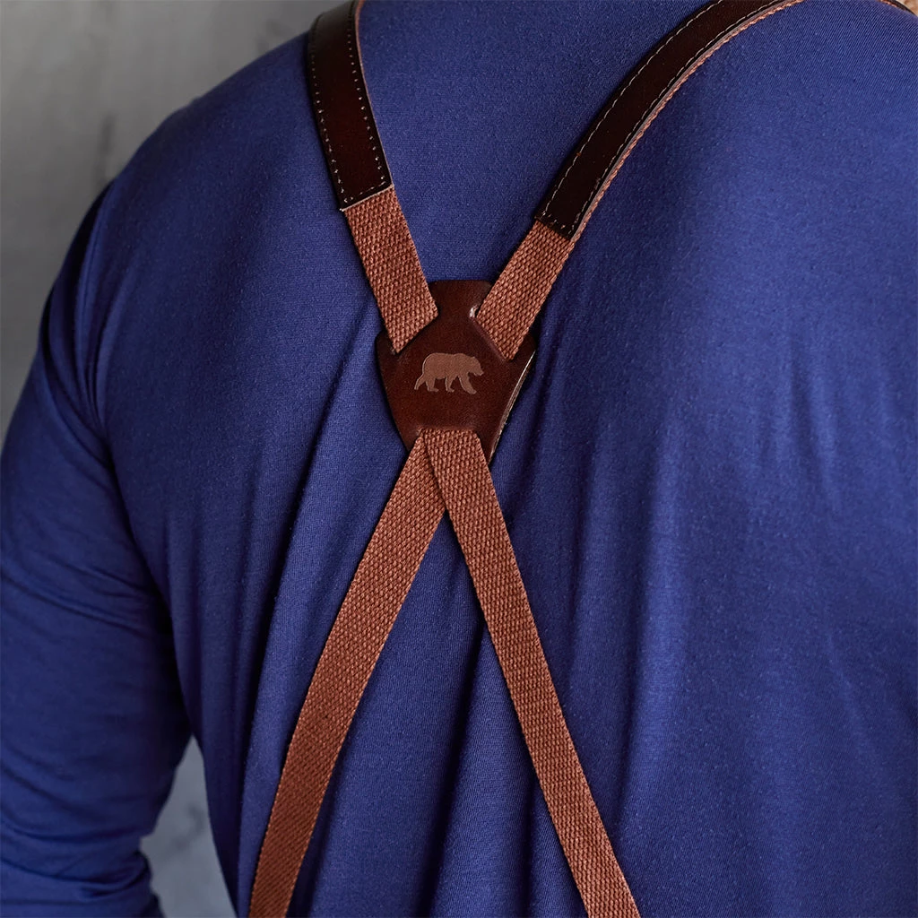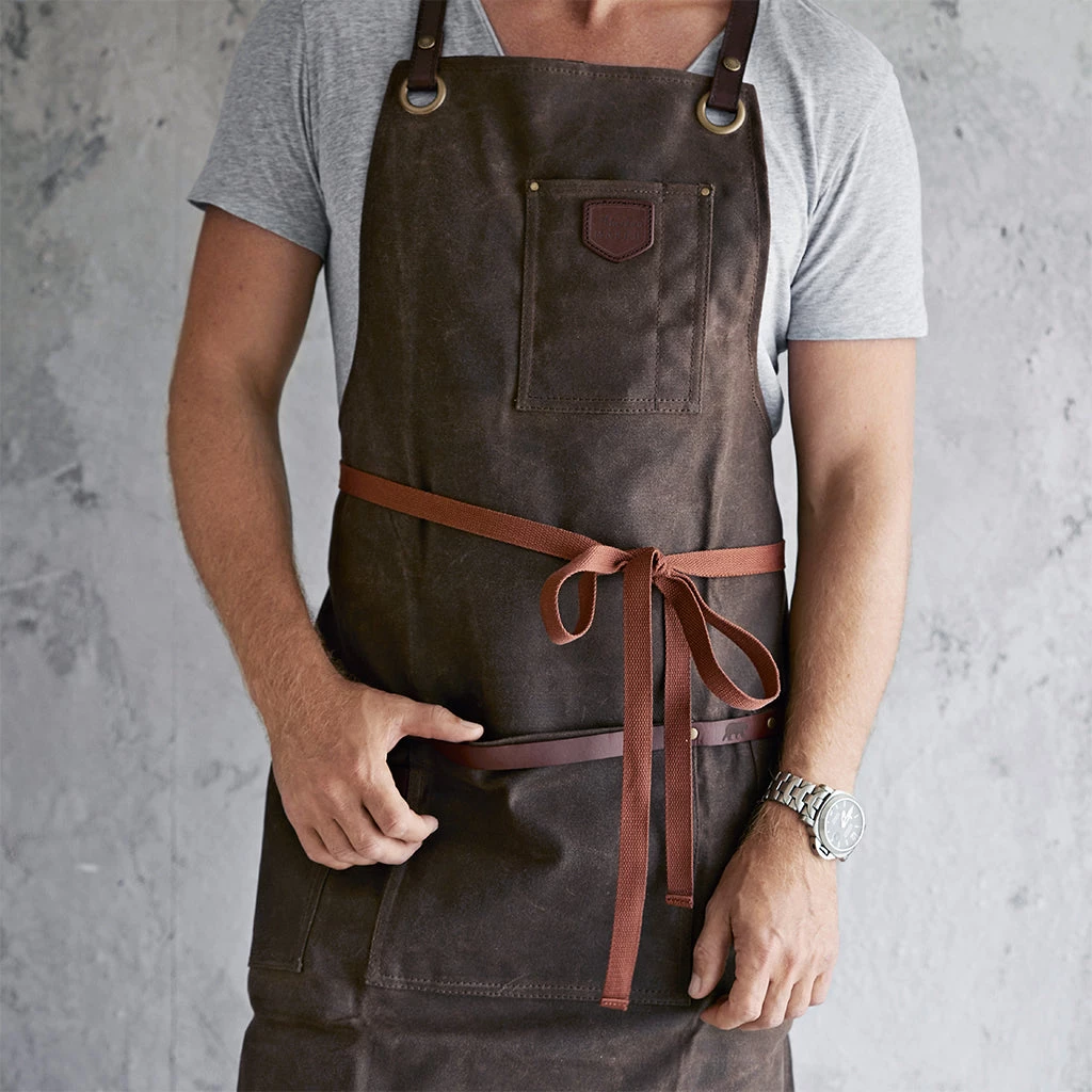 This apron is made with a thick-coated cotton canvas which makes the fabric waterproof and stain-resistant. To clean use a wet sponge.