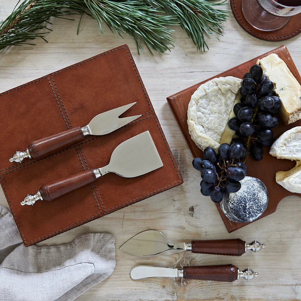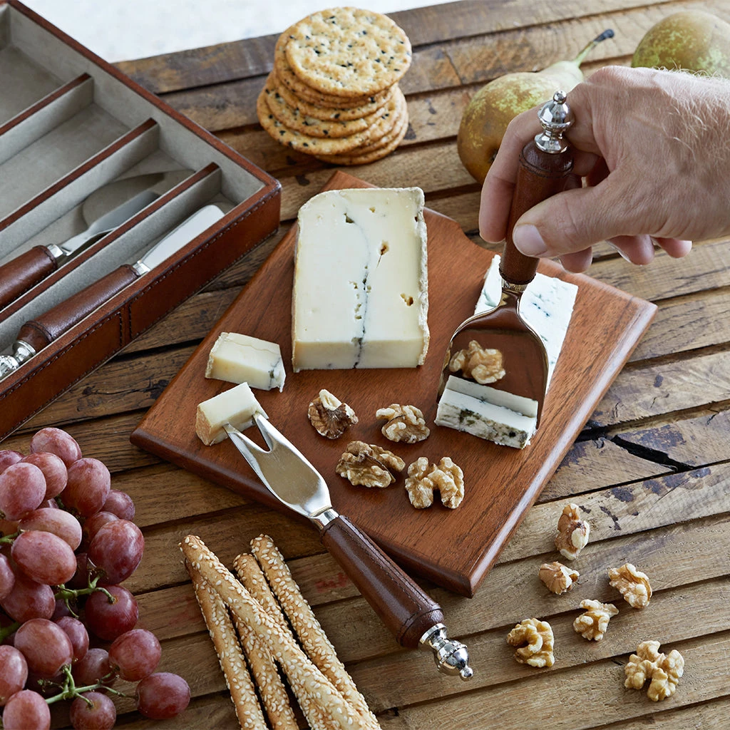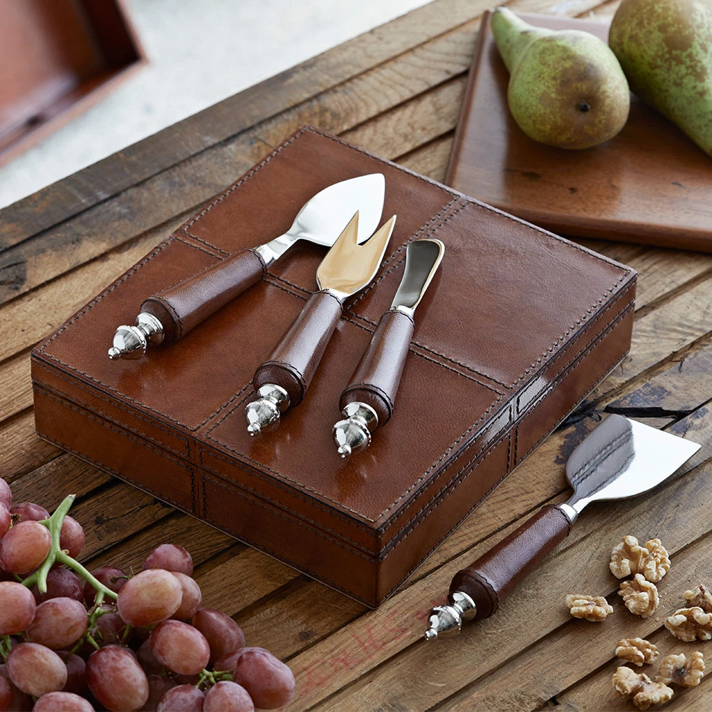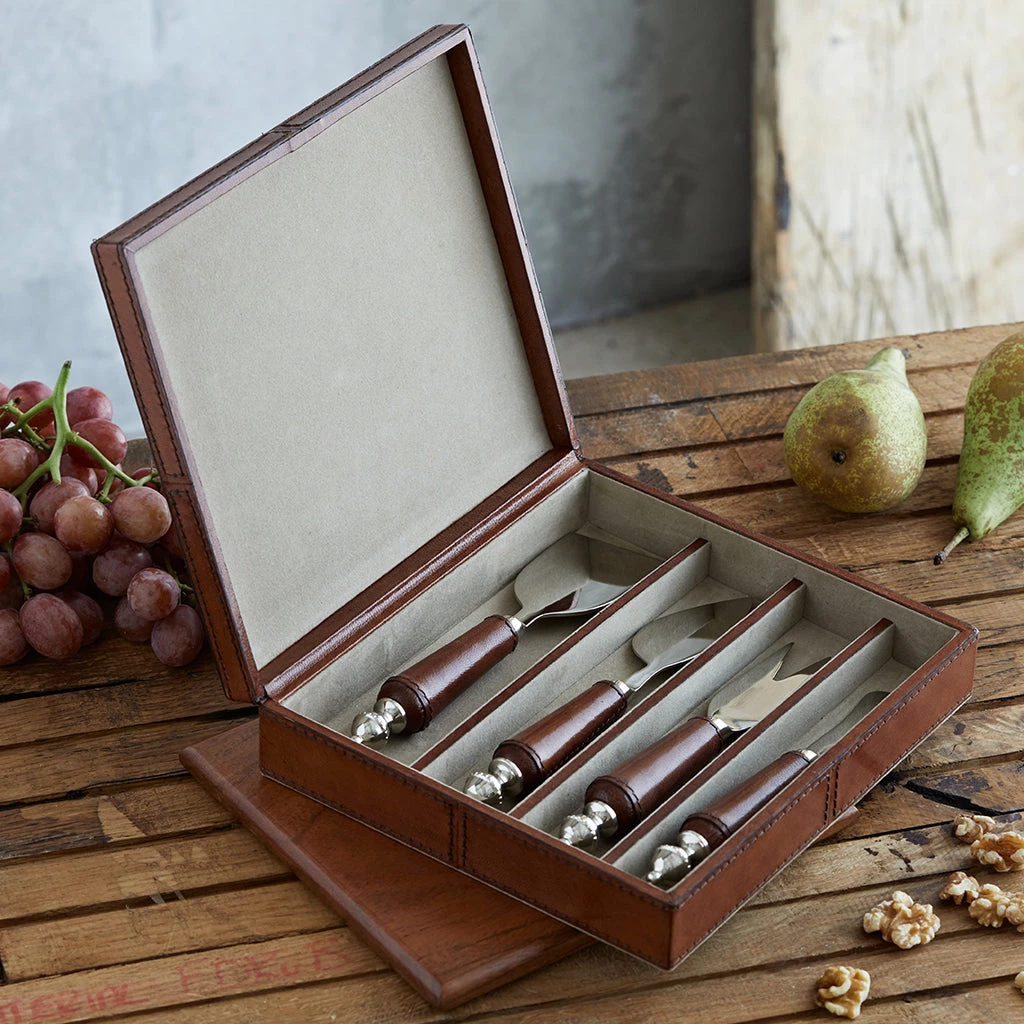 A smart leather hinged box with a removable wooden chopping board and four leather handled cheese knives. Including a cheese spreader, gorgonzola knife, flat cheese knife, cheese fork. The knives are nonserrated.Â