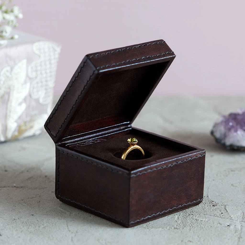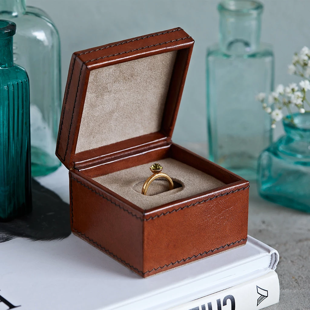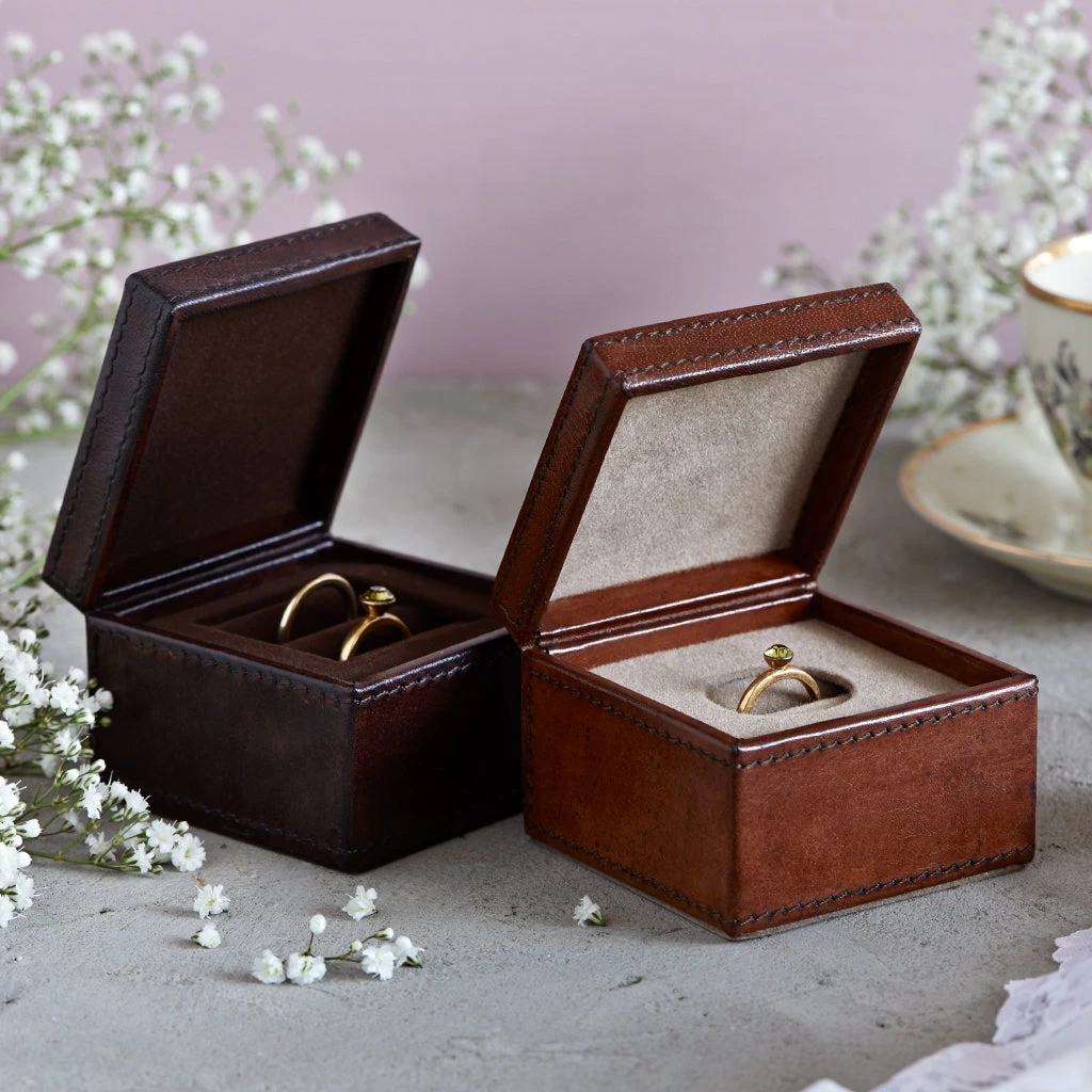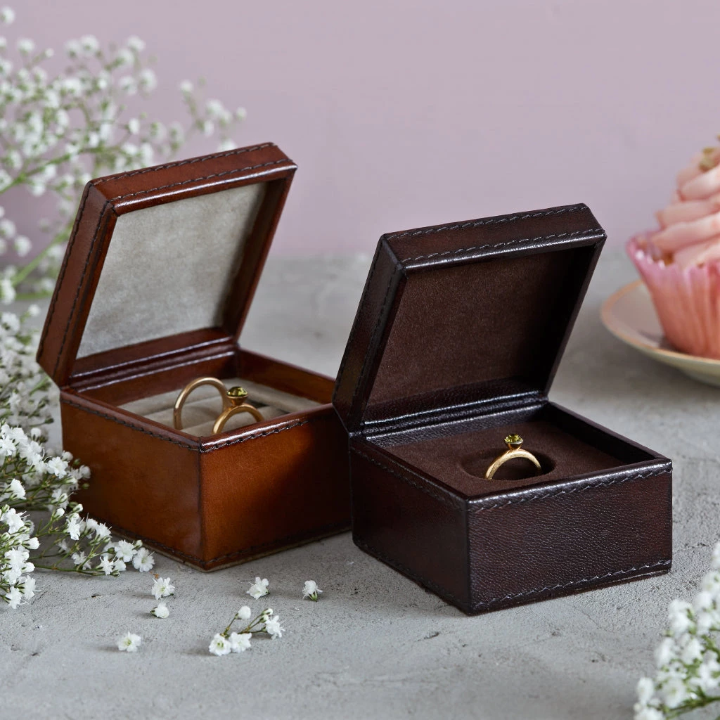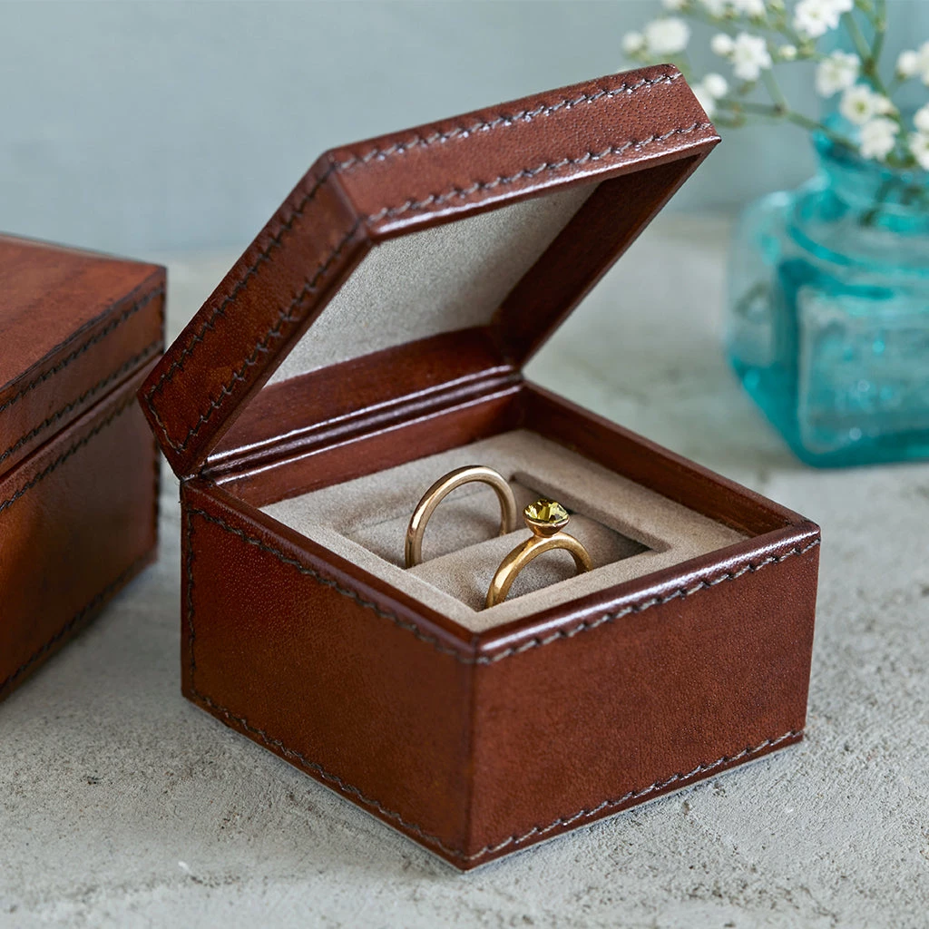 The leather ring box has a gently curved top and is lined in faux suede with a pad for a ring to sit snugly and securely. A lovely small box to be given on a third wedding anniversary, for a best man to carry a ring on a wedding day or as a gift box for a special ring. A perfect betrothal ring box and you can emboss the date too, view our full guide to personalisation here.