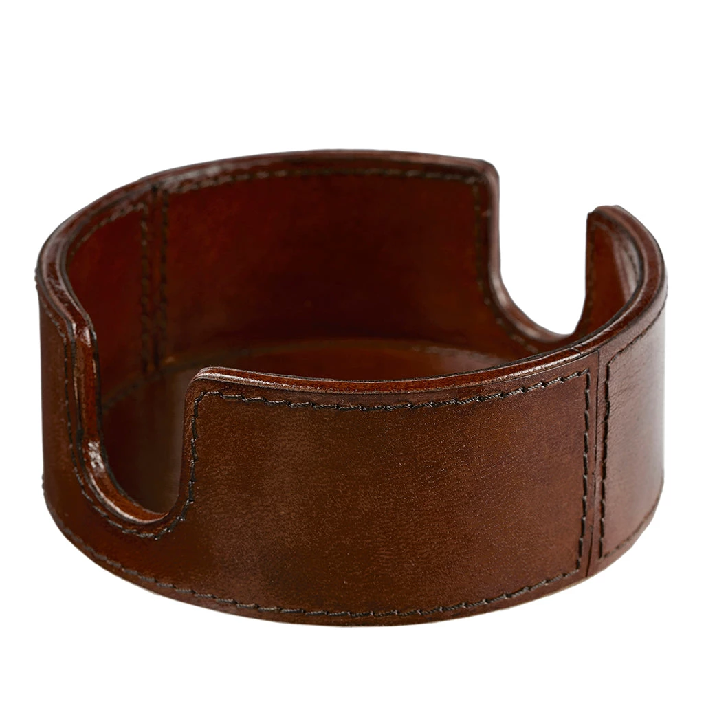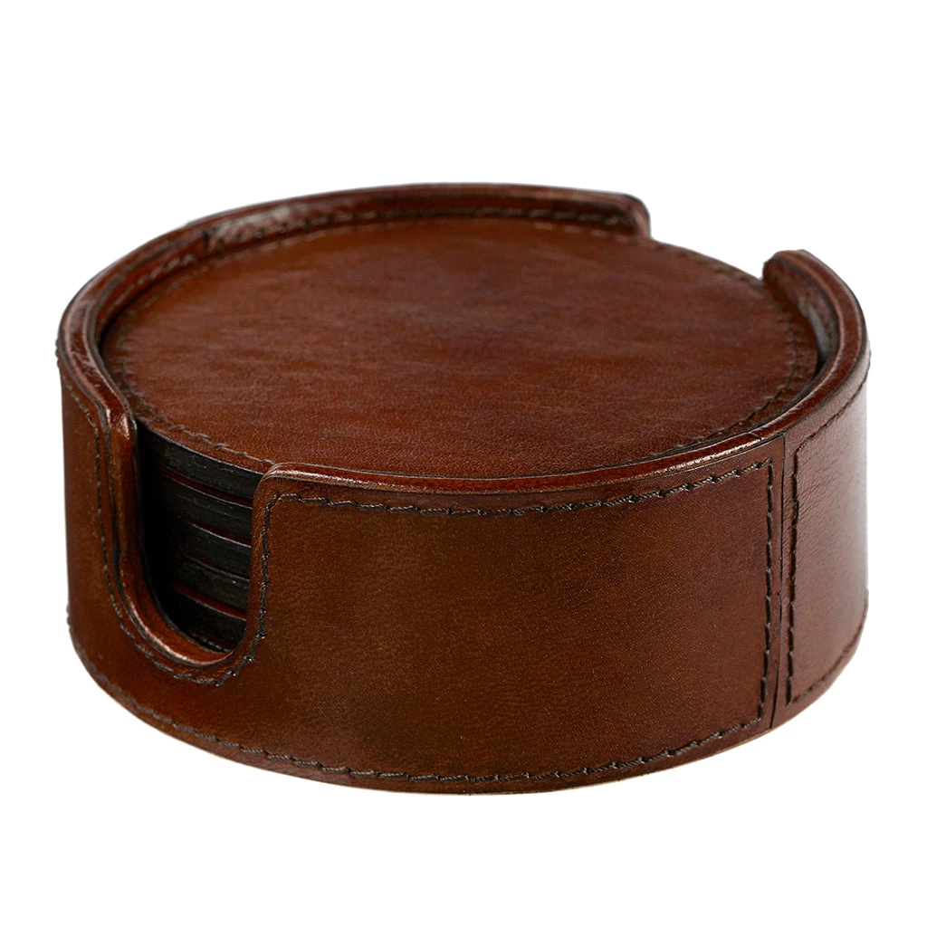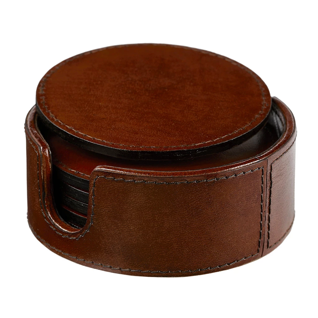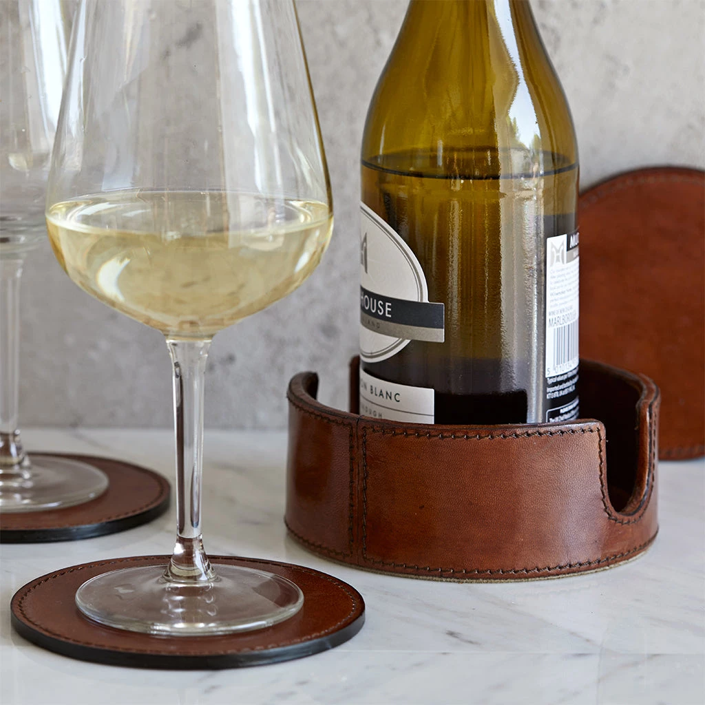 A new addition: a leather round wine bottle coaster, or holder, and set of six round leather coasters that nest inside the holder.