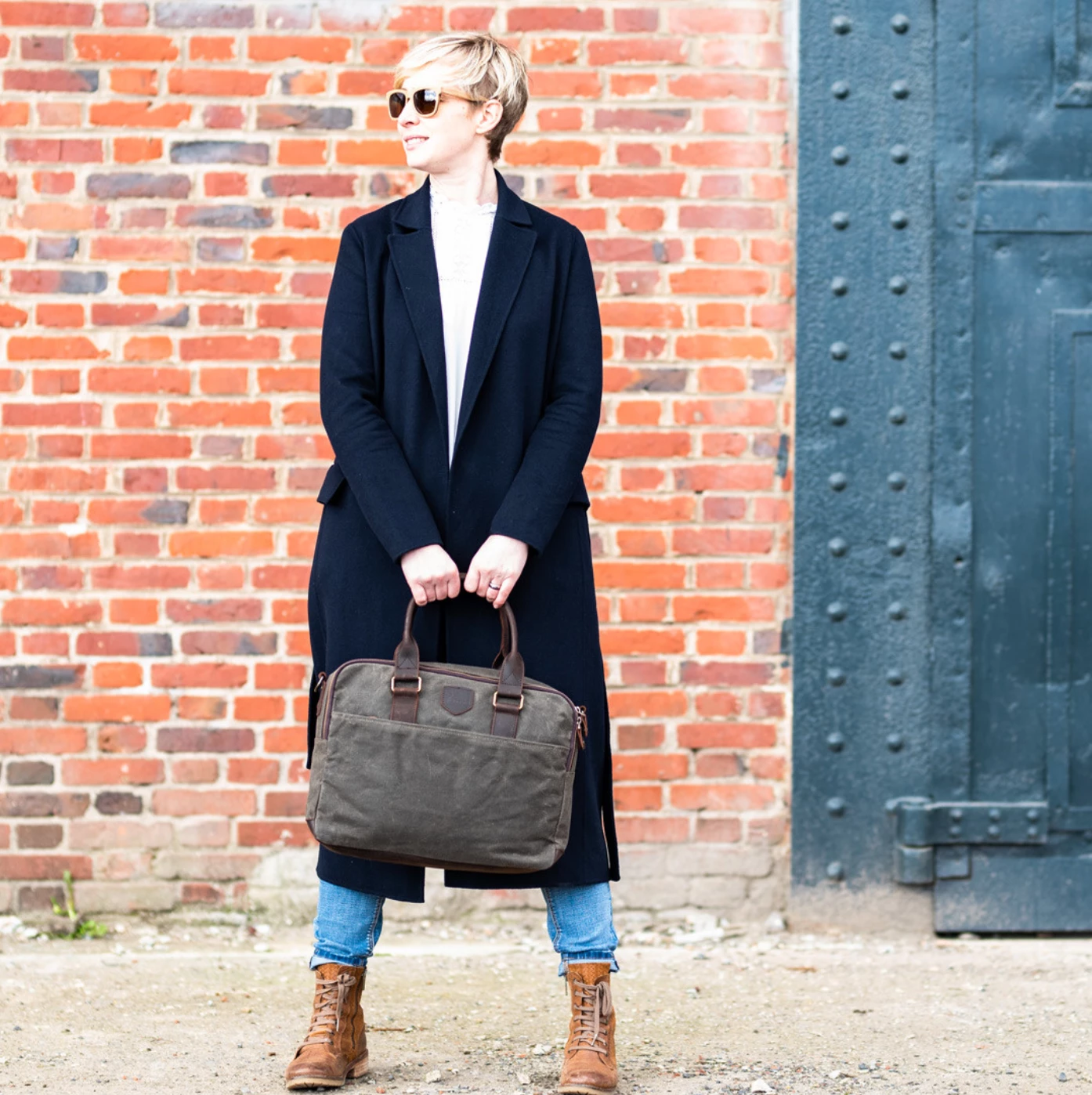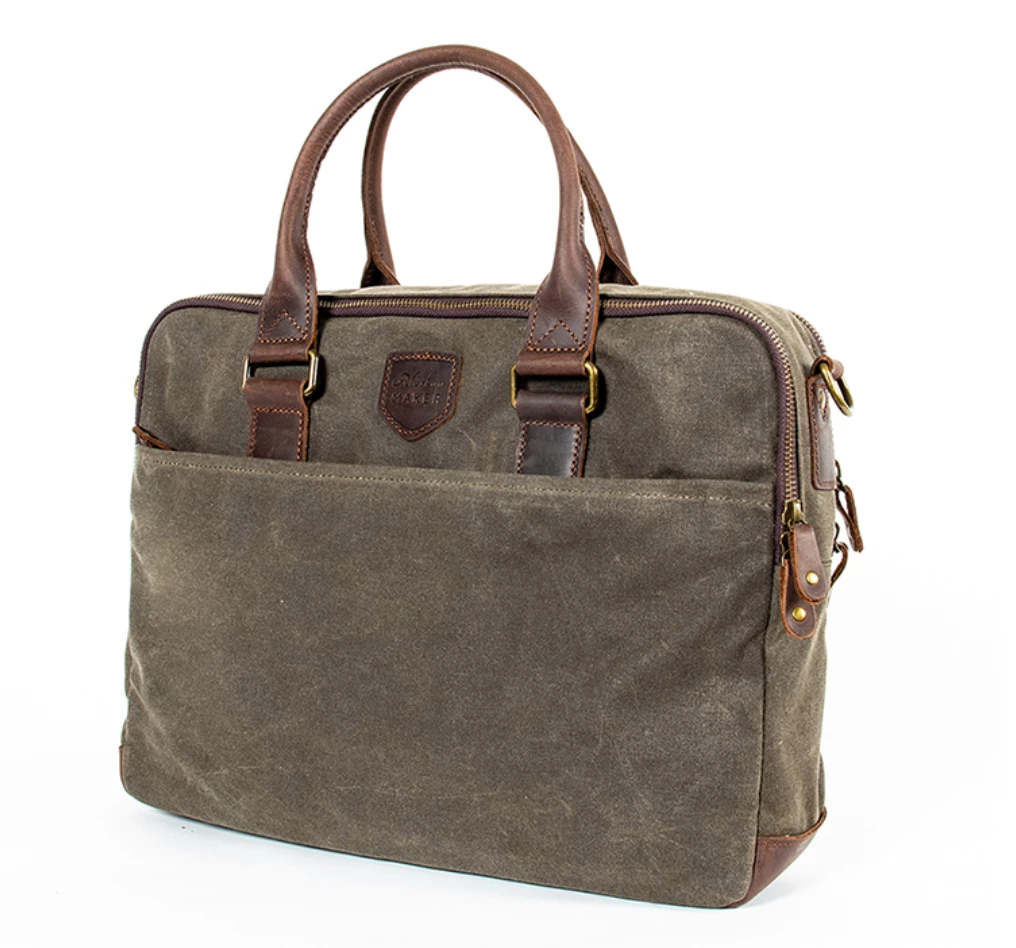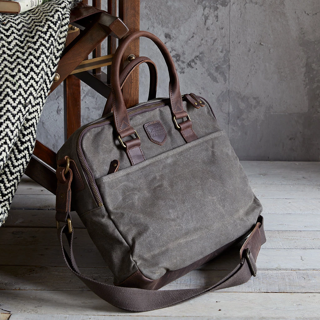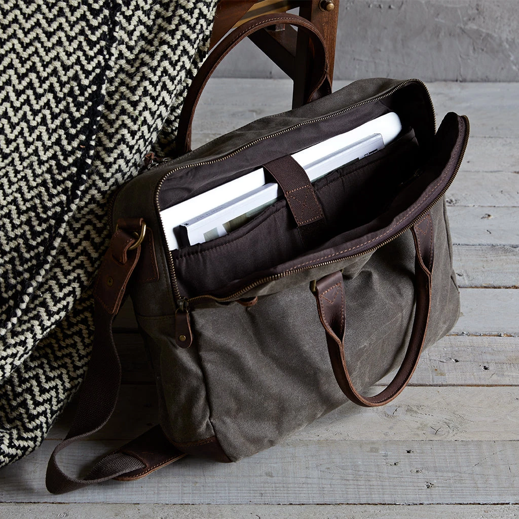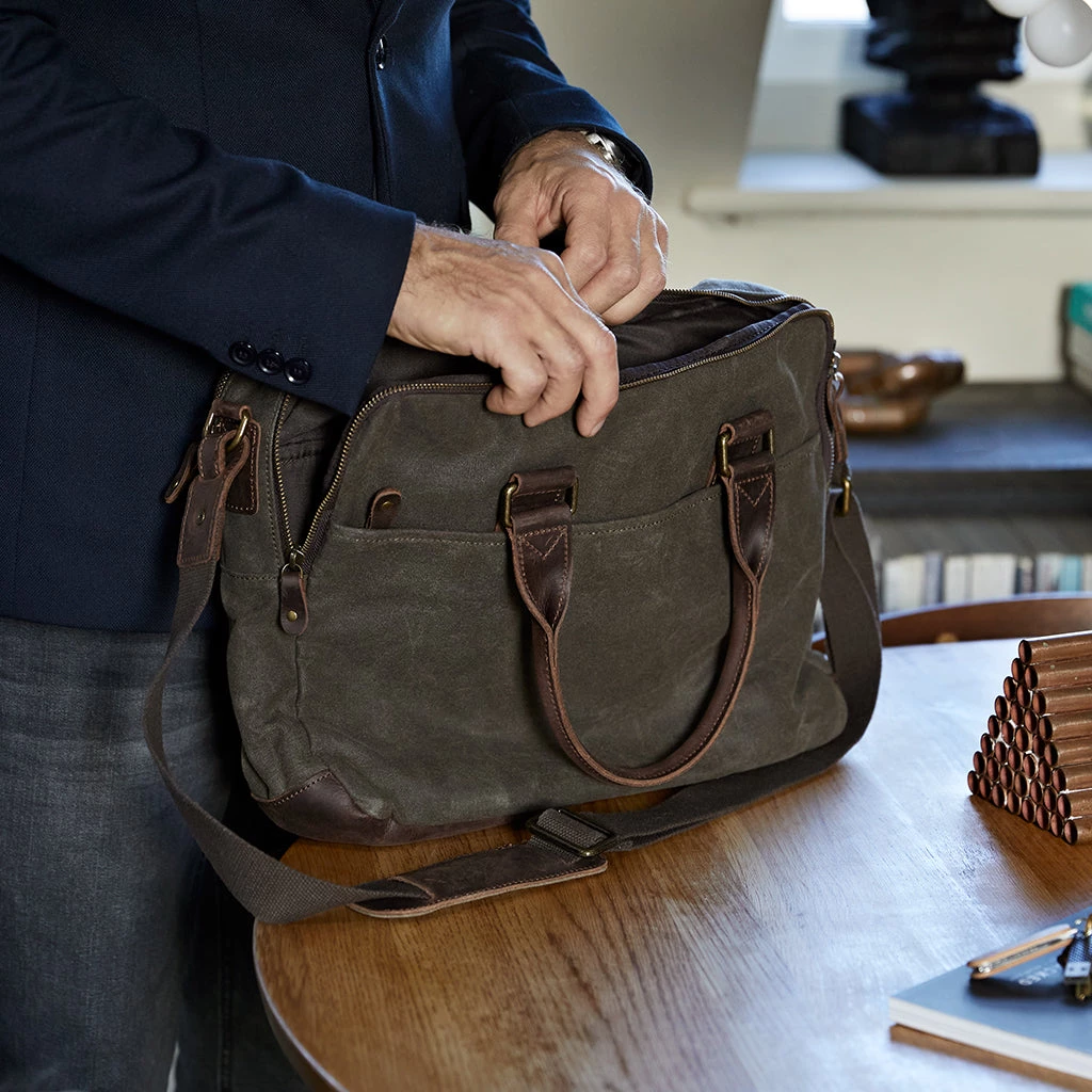 A smart canvas laptop bag for a man or woman in a practical khaki colour.