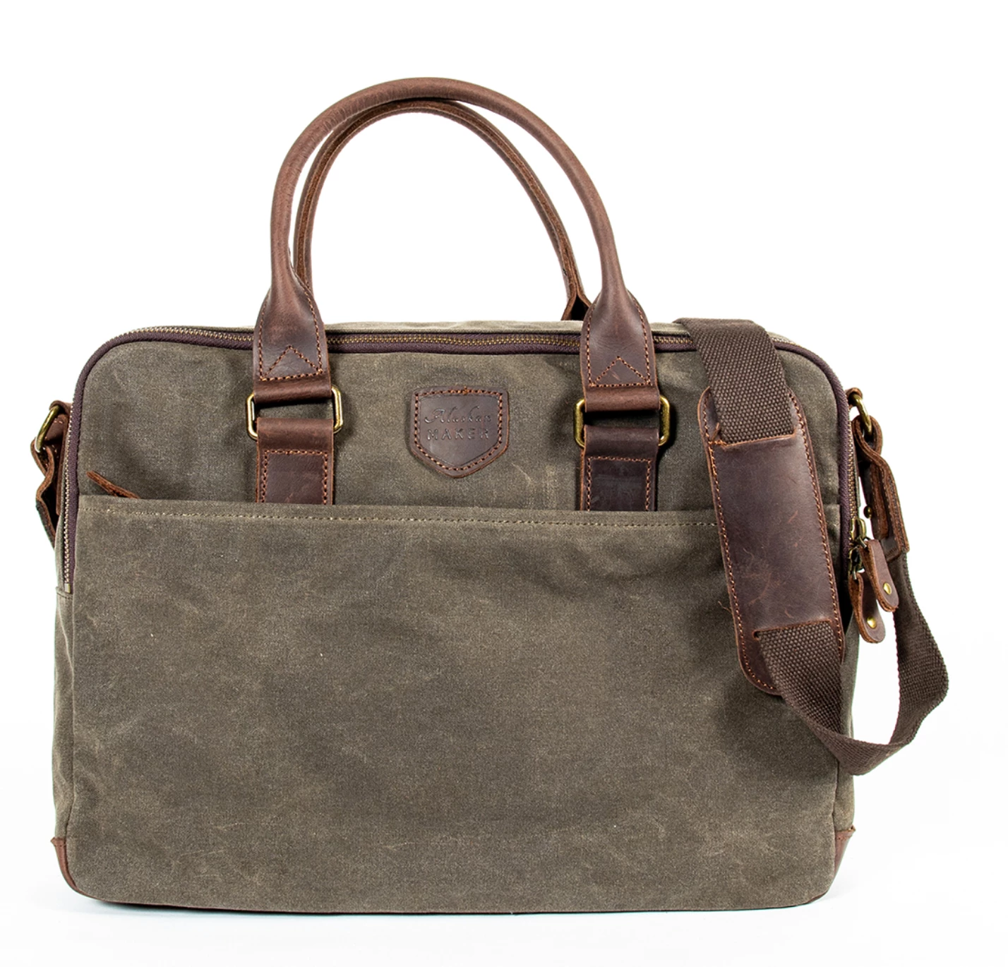 The canvas is 12oz coated cotton canvas which is thick and water-repellent and treated with stain-resistant protection. The bag is finished in real leather with brass fittings. The solid seams are supplemented with brass reinforcing rivets. To maintain the bag clean with a simple damp sponge.