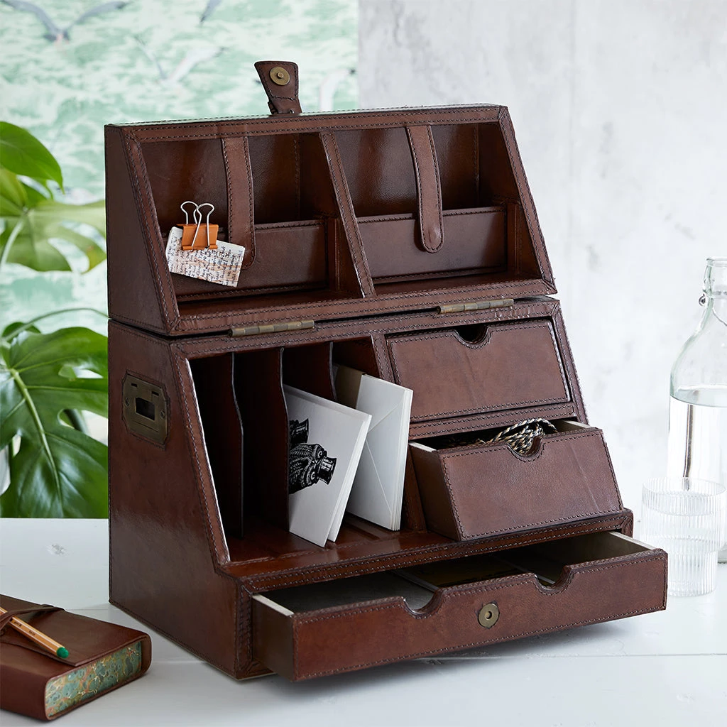 Our leather-bound stationery box causes a conundrum. Do you keep it open on your desk to admire the orderly storage of your correspondence material or closed to enjoy the conker coloured smooth leather and brass coloured carry handles?