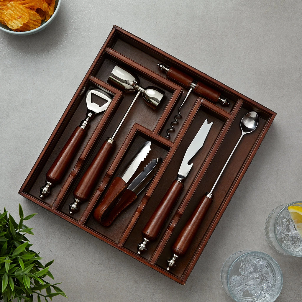 This six piece bar tool collection includes: A leather handled corkscrew, a bottle opener, a spirit measure, ice tongs, spoon and a garnish knife plus a leather organsier to store and show them when they are not in use.