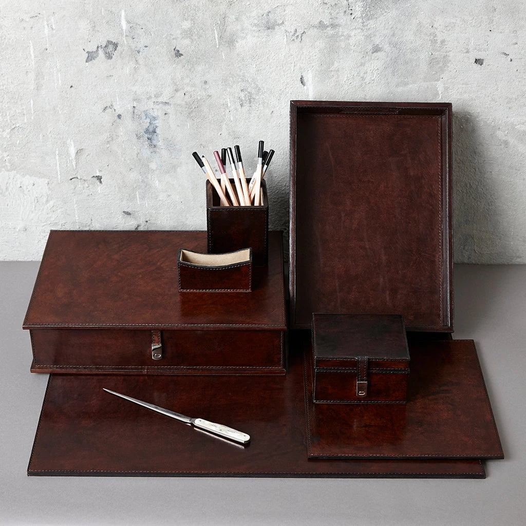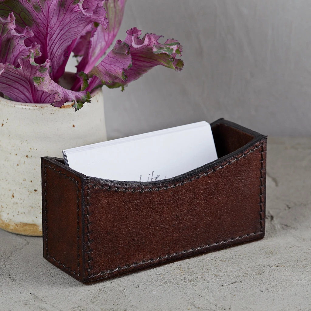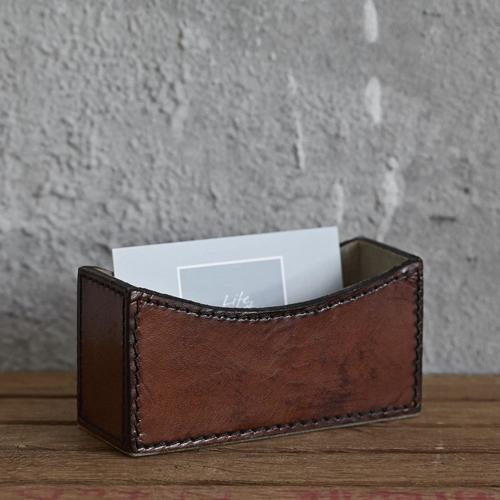 A leather business card holder for storing or displaying business or calling cards. A smart addition to any study. Great as a small gift or as part of a larger leather desk accessories gift. The business card holder is hand crafted and the leather stained with an antiqued finish to coordinate with the other desk accessories.Â