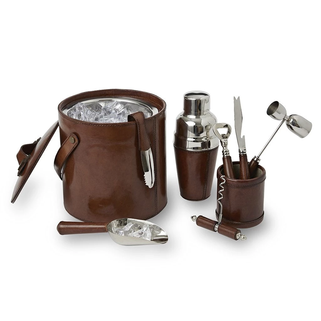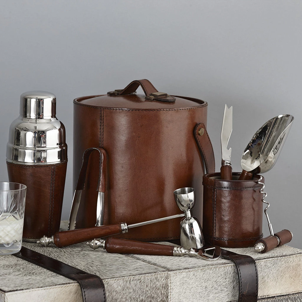 Including our set of five bar tools, a standard size leather ice bucket with tongs and our popular cocktail shaker, you will be all set for a summer event. A leather storage pot completes the cocktail hosting set to keep your bar area tidy.