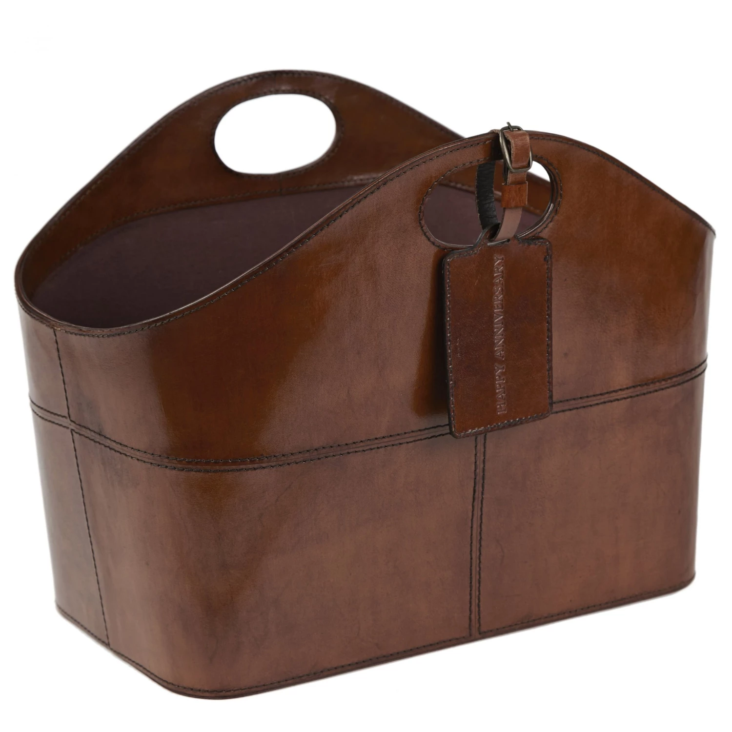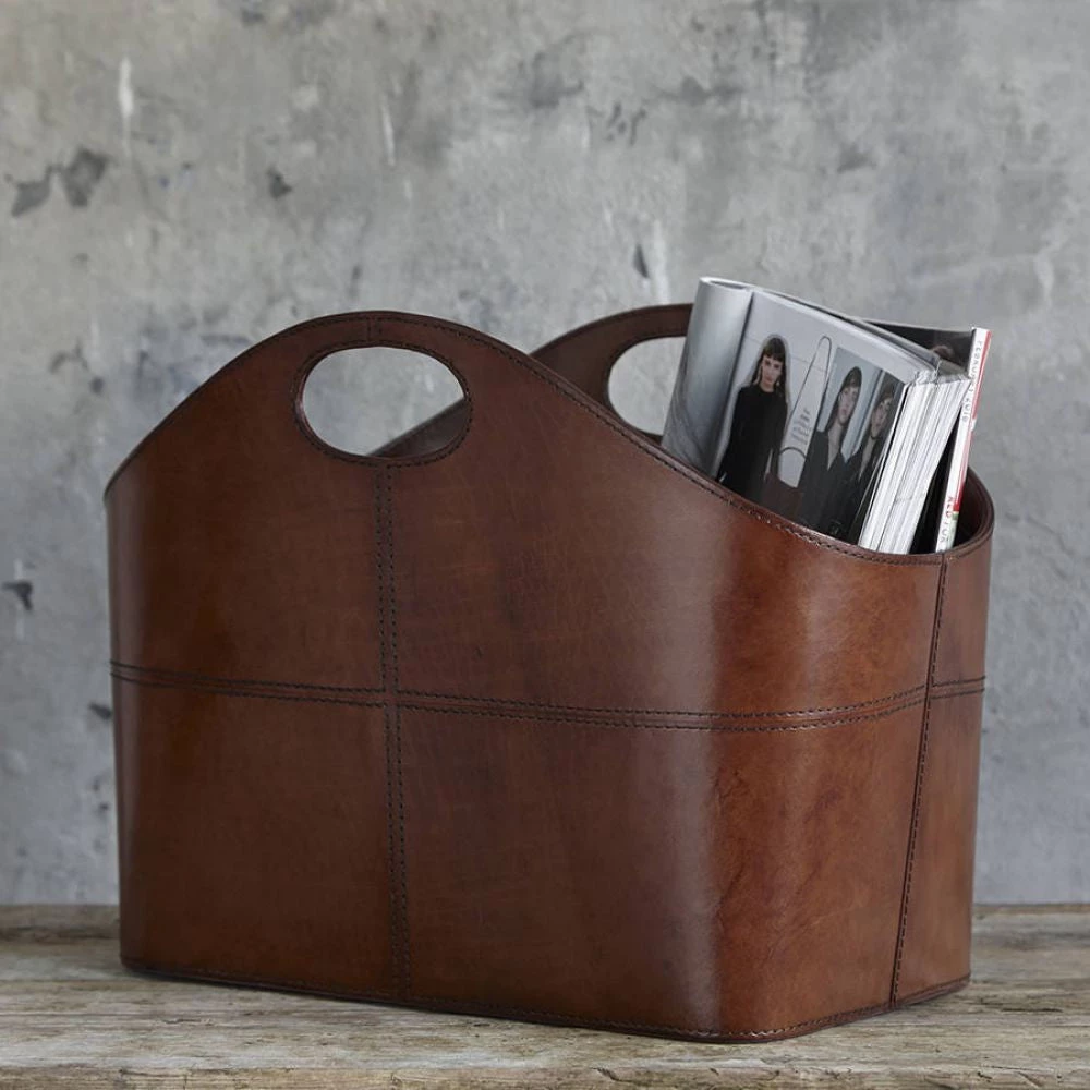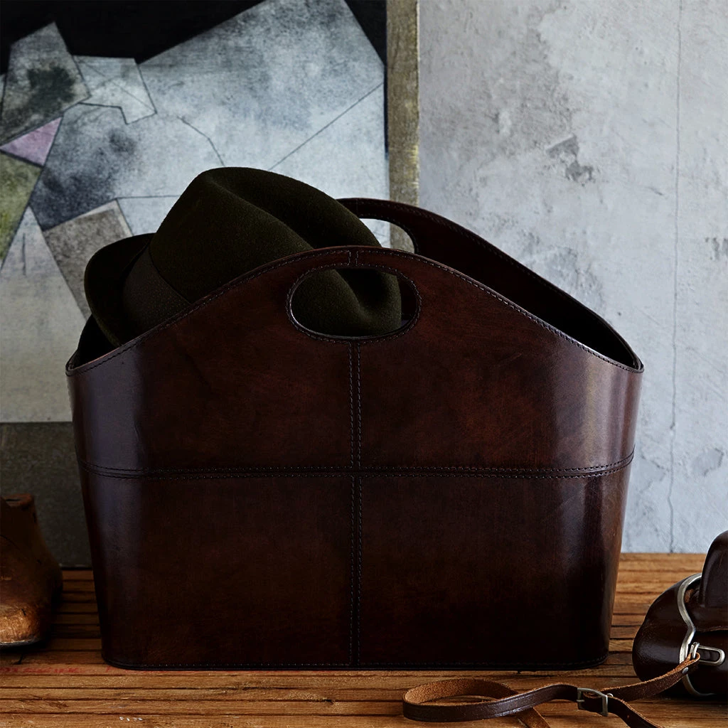 Designed to create a clean curved continuous line along the top of the basket. Integrated handles were the solution to form this stylish leather storage basket. Double rows of stitching further highlight the leather side panels. A cotton lining complements the rich colour of the leather.
