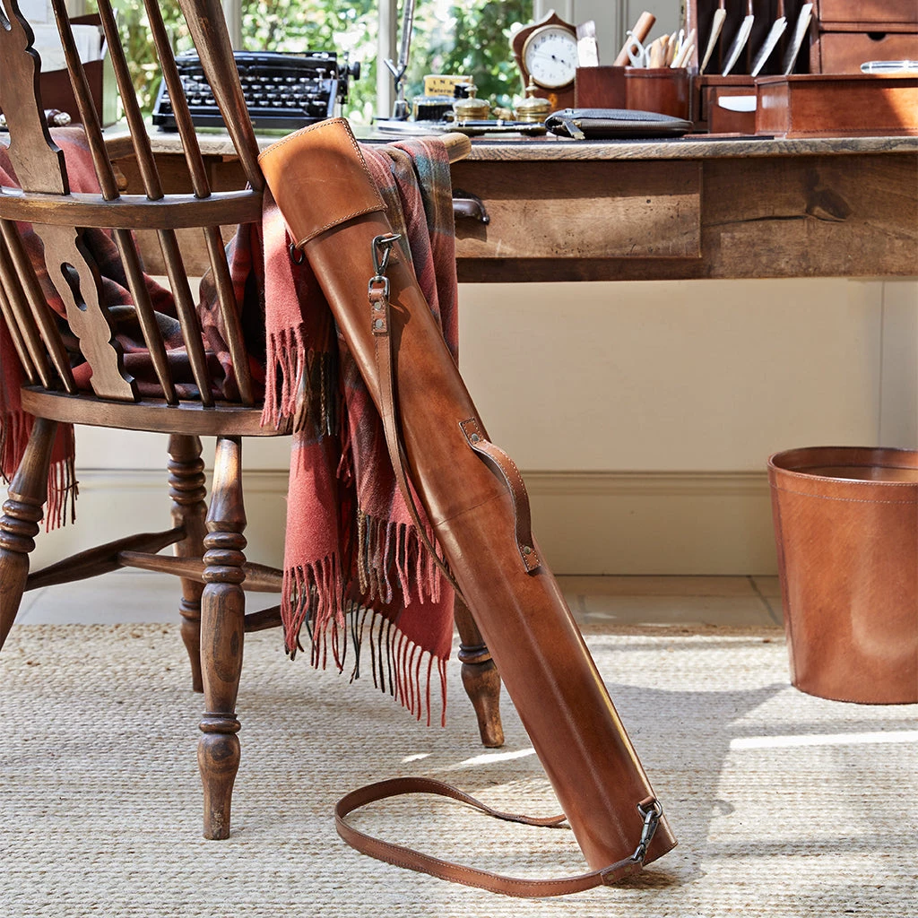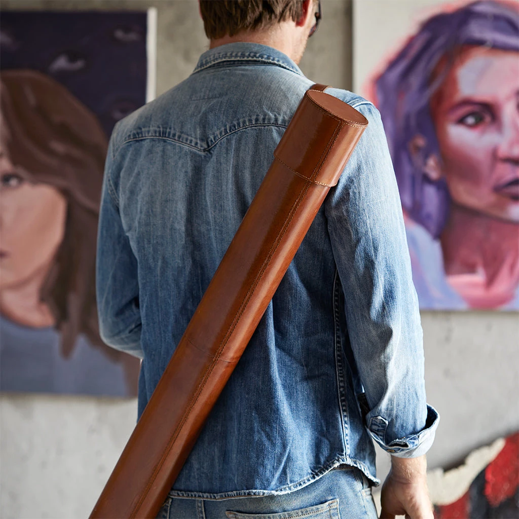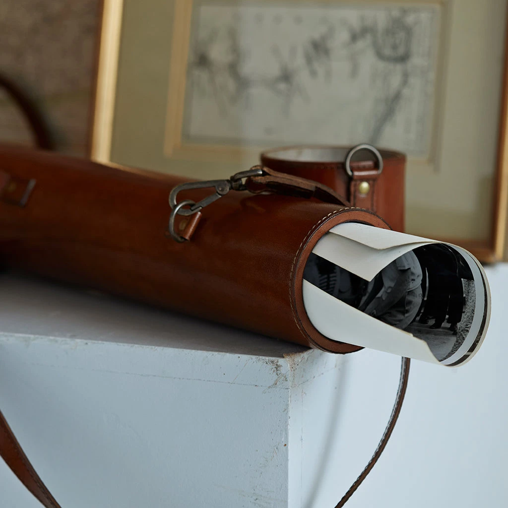 Featuring a hard case tube for storing documents, a removable lid and leather carry strap.