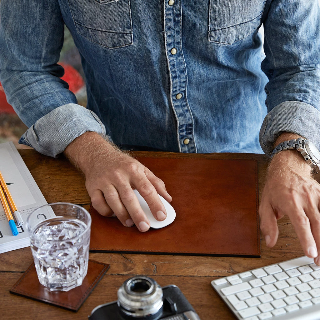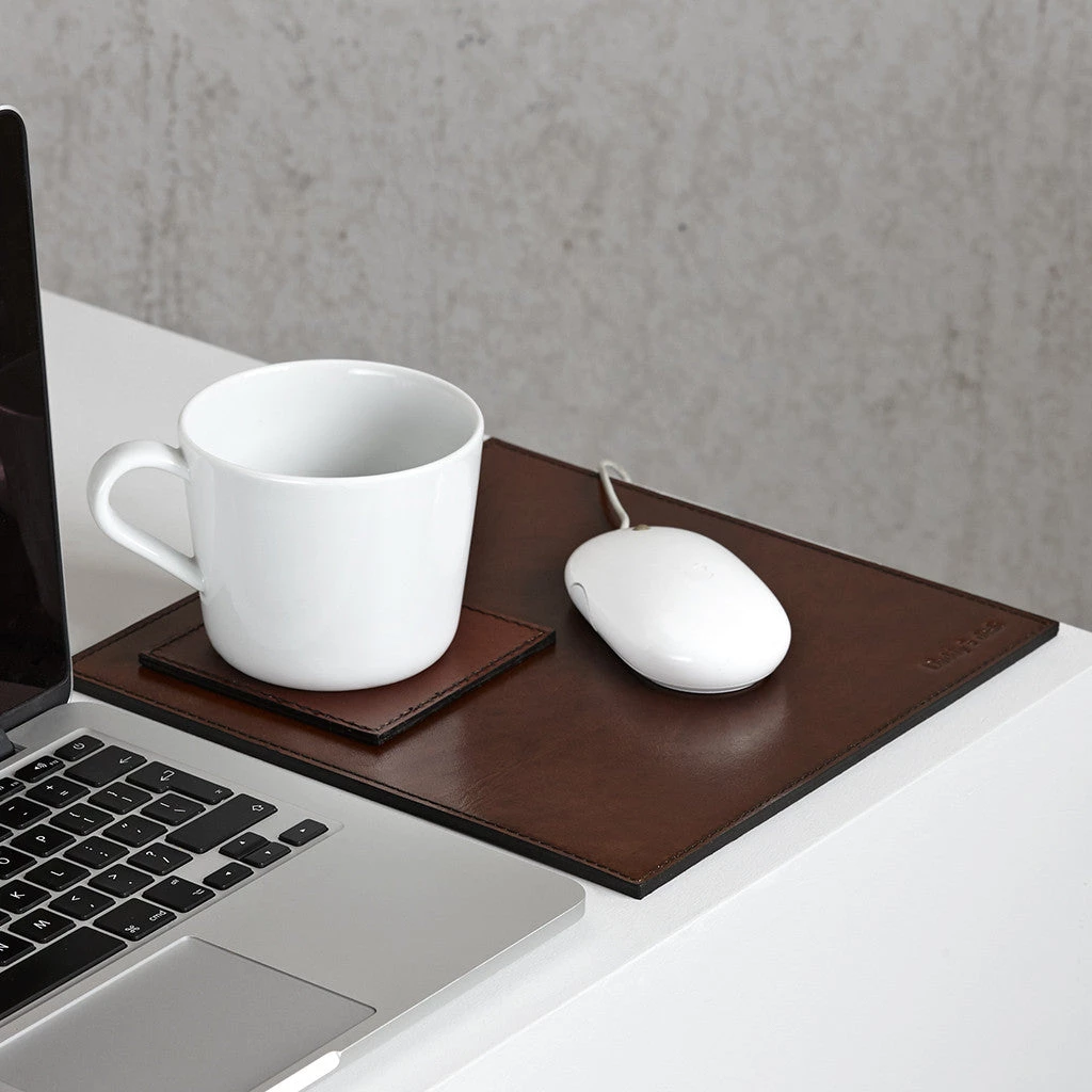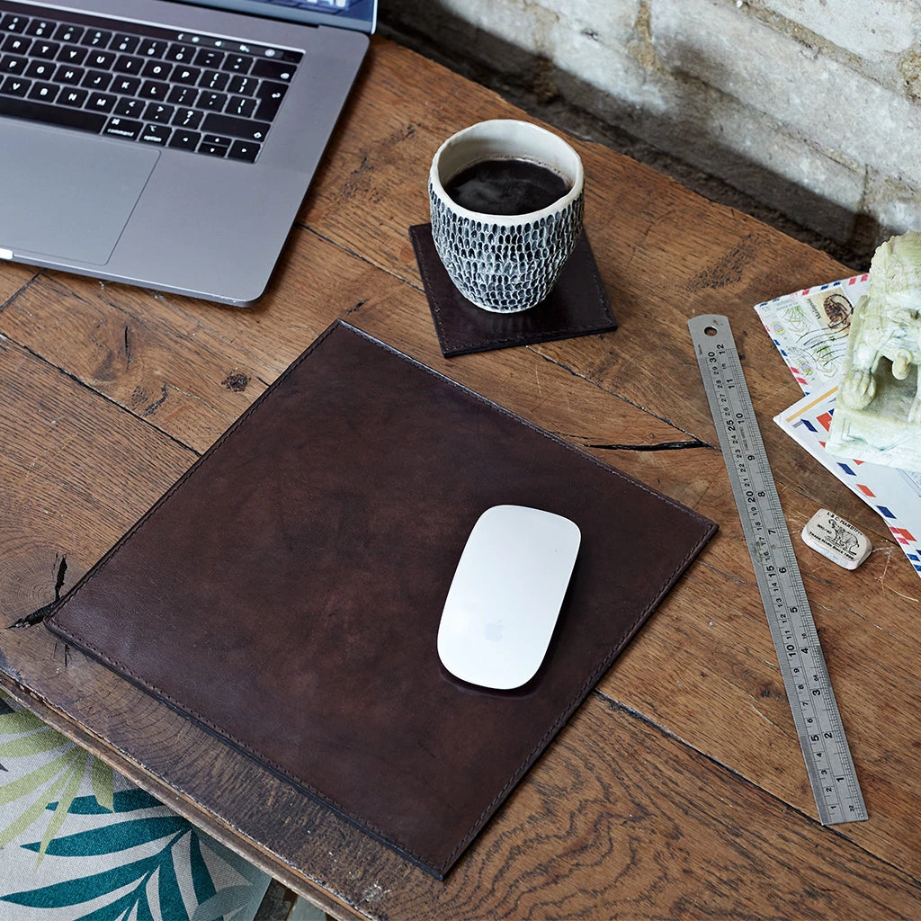 A charming gift set of our leather mouse mat with a matching square coaster.