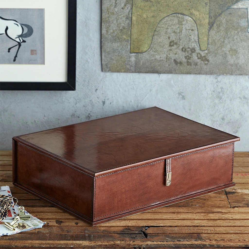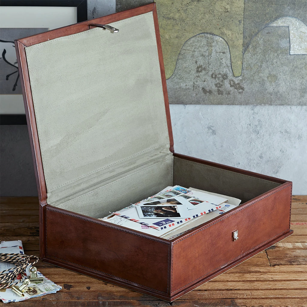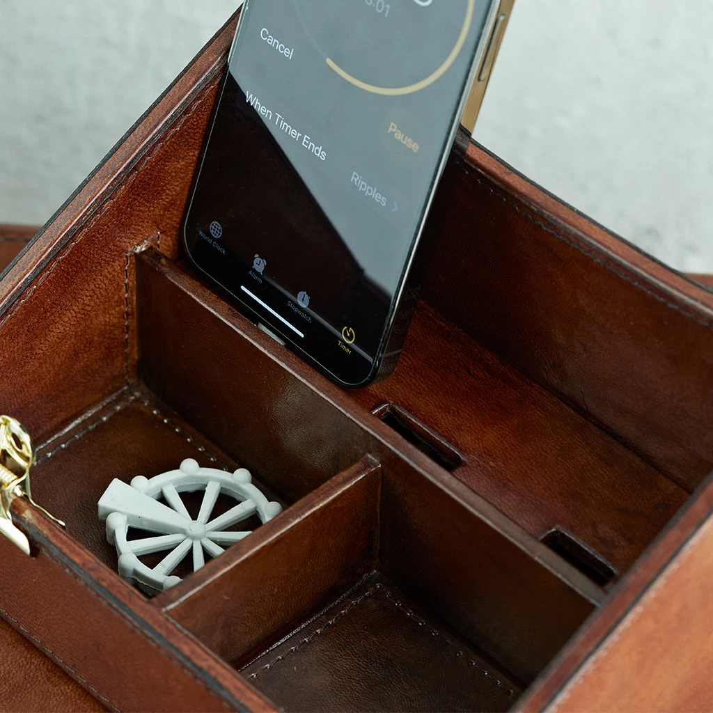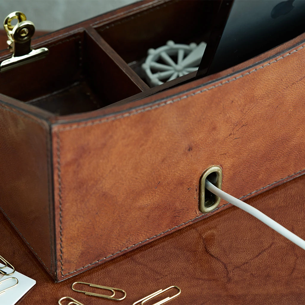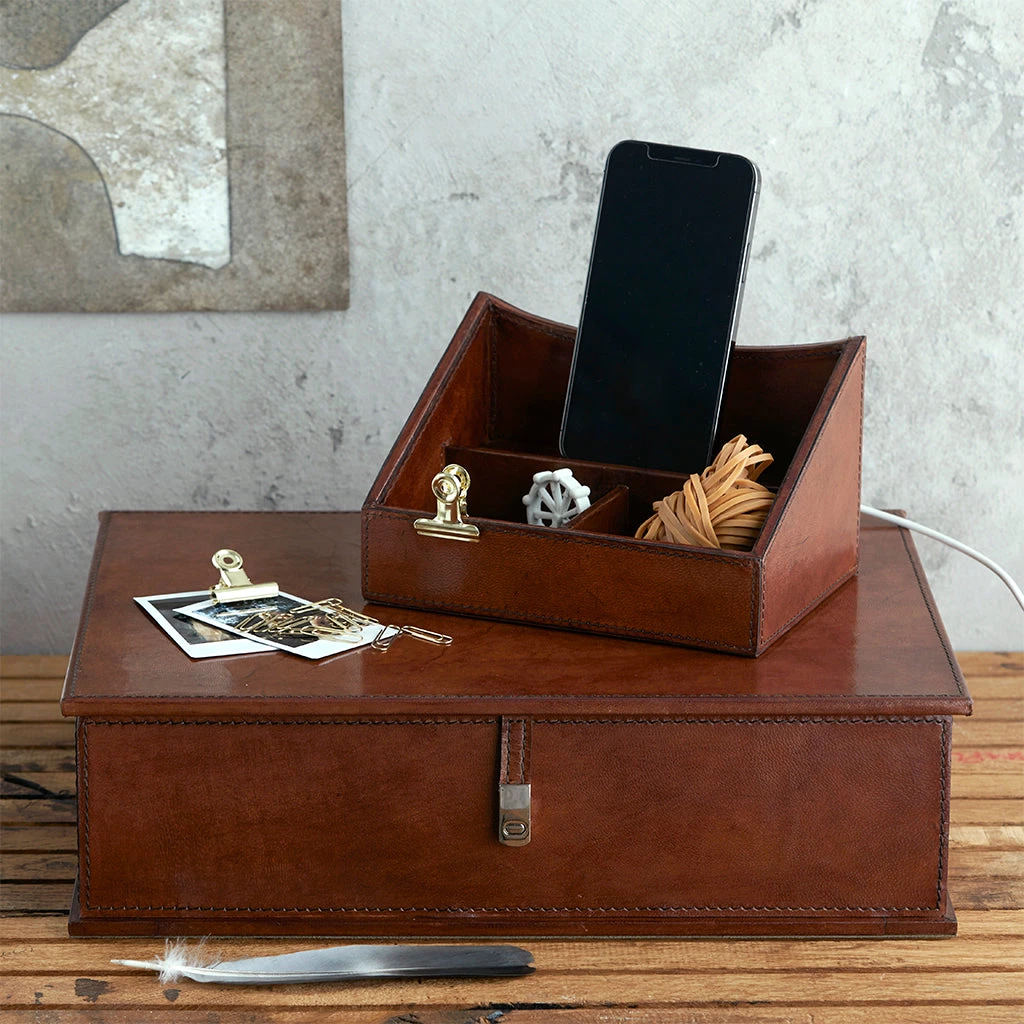A new combination ideal for a hall or desk space: our bestselling box file with a matching leather desk tidy. The desk tidy is suitable for charging a mobile phone or mini iPad and within the two sections storing small desk accessories such as stamps, paperclips, elastic bands in the base.