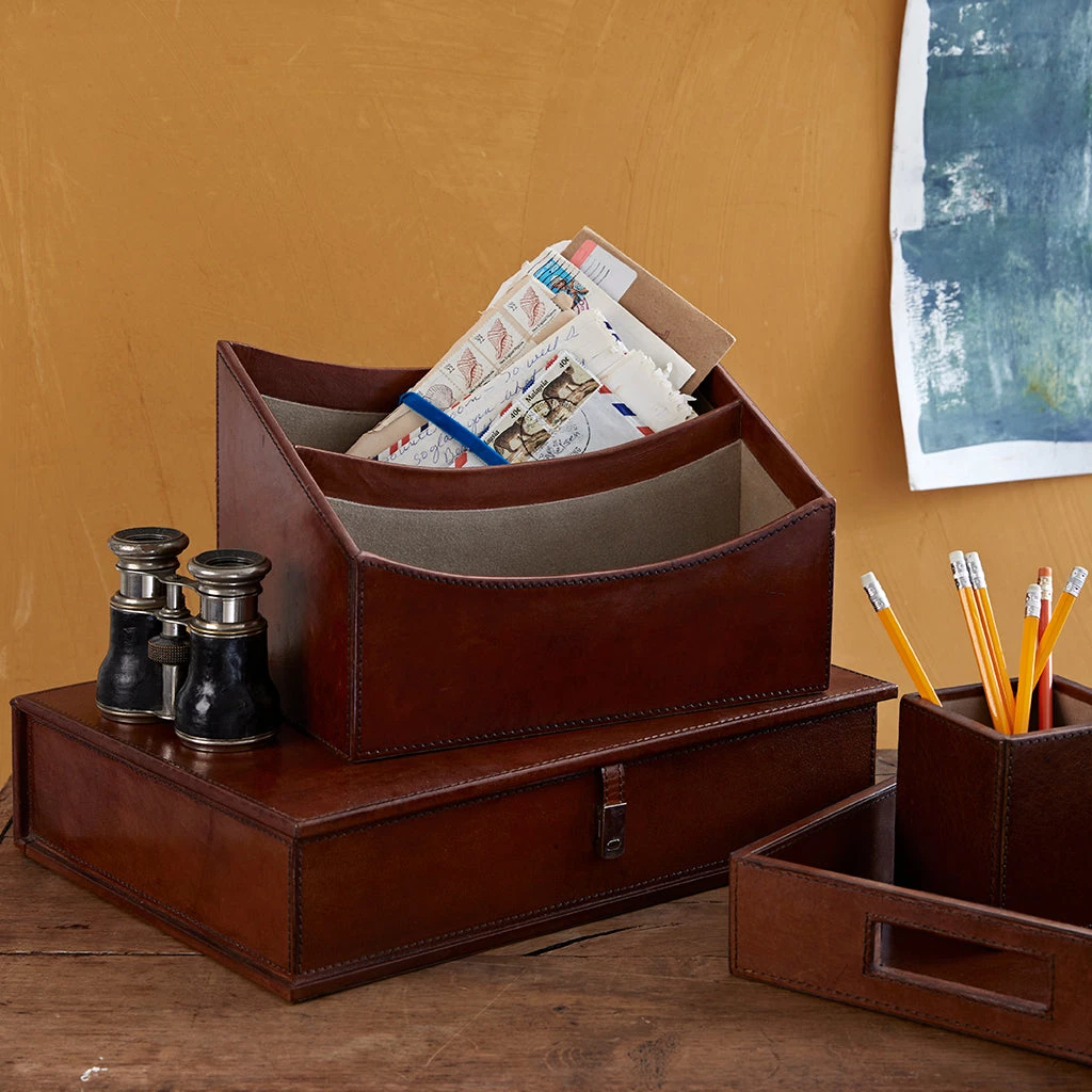 The desk set consists of conker brown leather desk accessories which includes an A4 in tray, letter rack and square pen pot,
