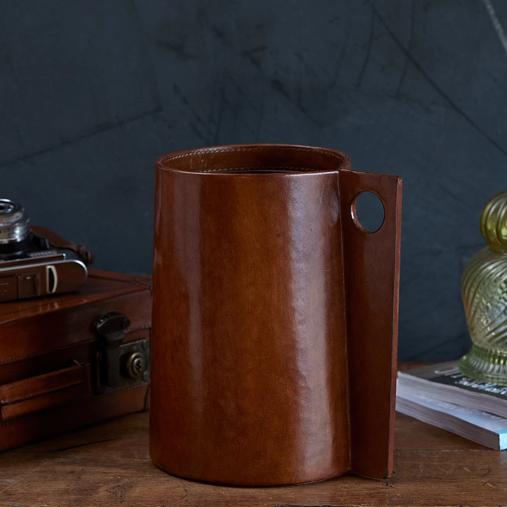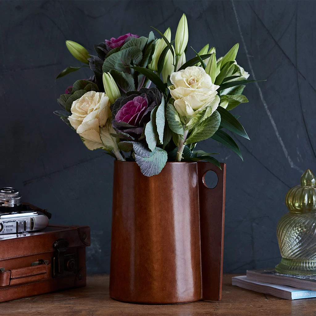 A unique leather jug with a retro design handle. Inside is a removable glass holder, fill with water and add flowers. A smart addition to an office or hall way.