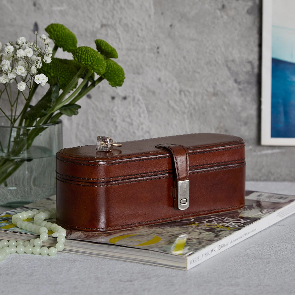A small leather jewellery box is a perfect gift, a good size for a first jewellery box but big enough to keep on display and ready for daily use. With rounded edges – the small leather jewellery box is ideal for packing in your luggage and won’t snag clothing if travelling.
