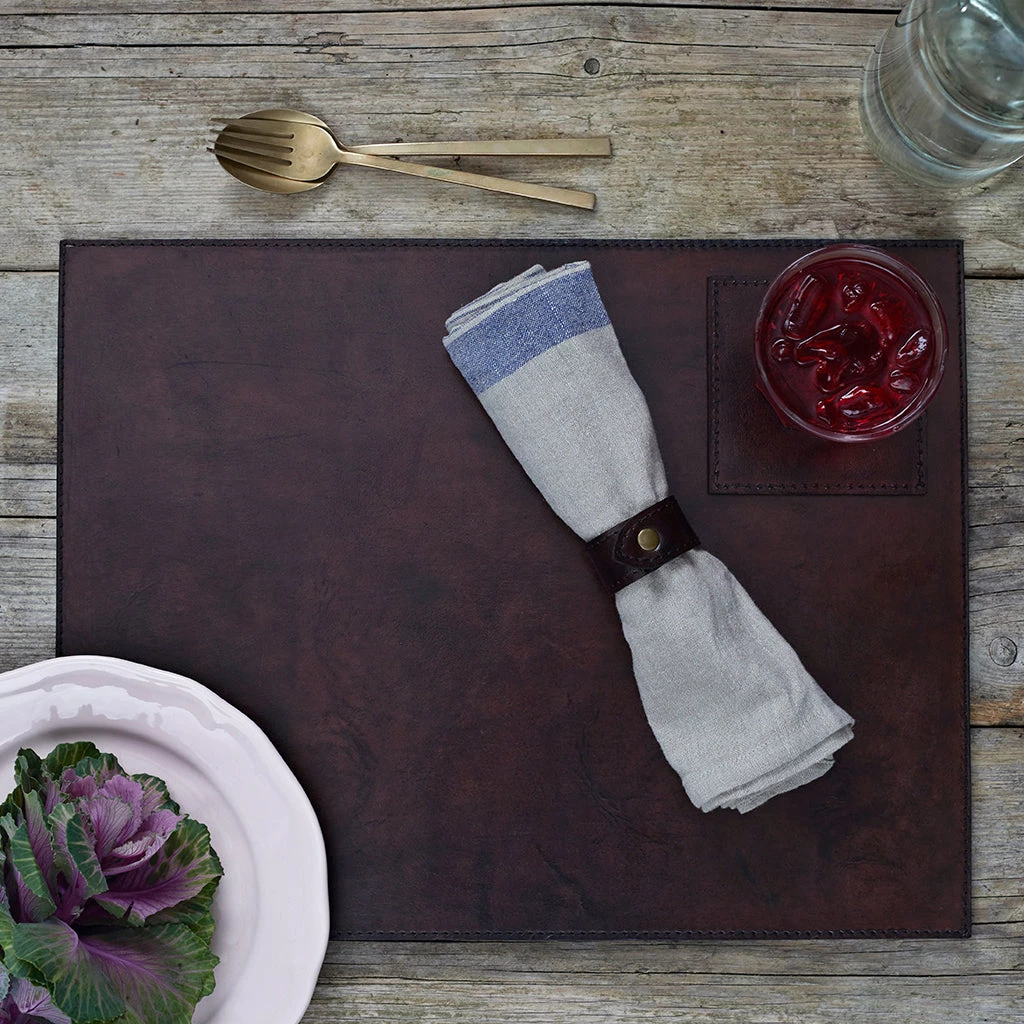 Looking sophisticated on a bare wooden table, the two sided leather place mat will prevent scratches. Â Framing a place to display cutlery and glassware.