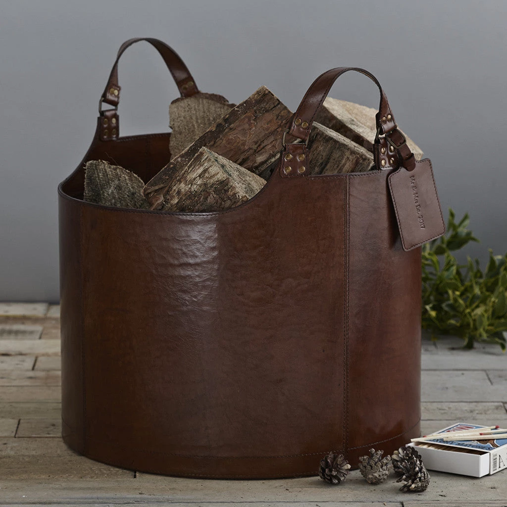 A smaller matching leather round storage basket perfect for kindling is also available.