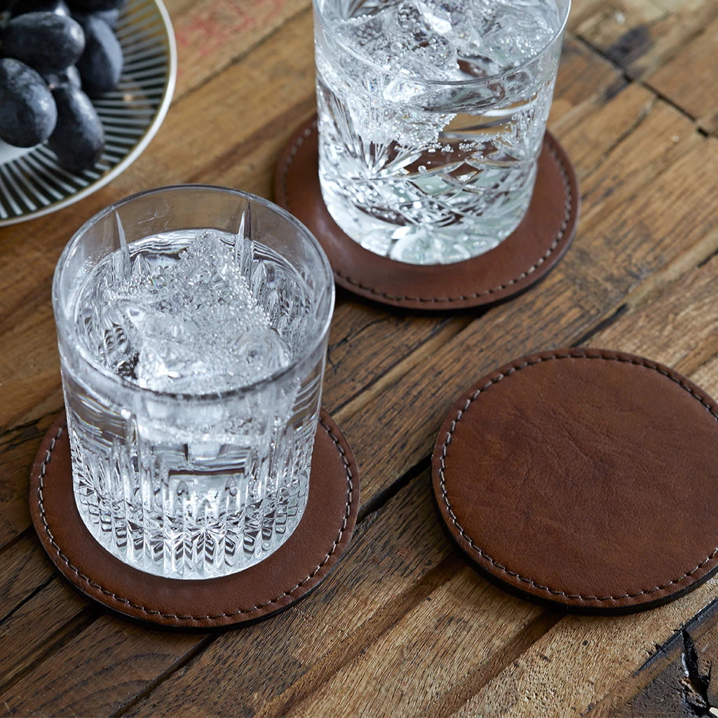 Our coasters are leather on both sides and neatly stitched around the edge.