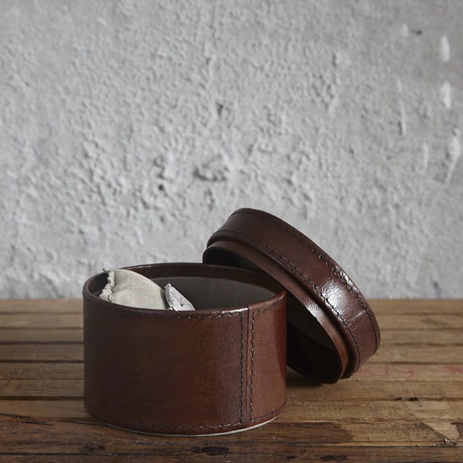 A smart round leather gift box for a single watch or other piece of jewellery.  Use for storage. Personalise the lid to remember a special occasion, view our full guide to personalisation here.