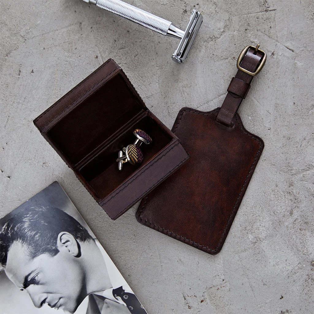 The set includes a leather luggage tag, with an address card accessible when the strap is removed, embossed with your chosen details such as initials, and a matching leather mini travel box that we suggest for cufflinks or earrings. A secure magnetic closure means it can keep the contents safe during your journey. This can be personalised too as an extra touch, view our full guide to personalisation here.