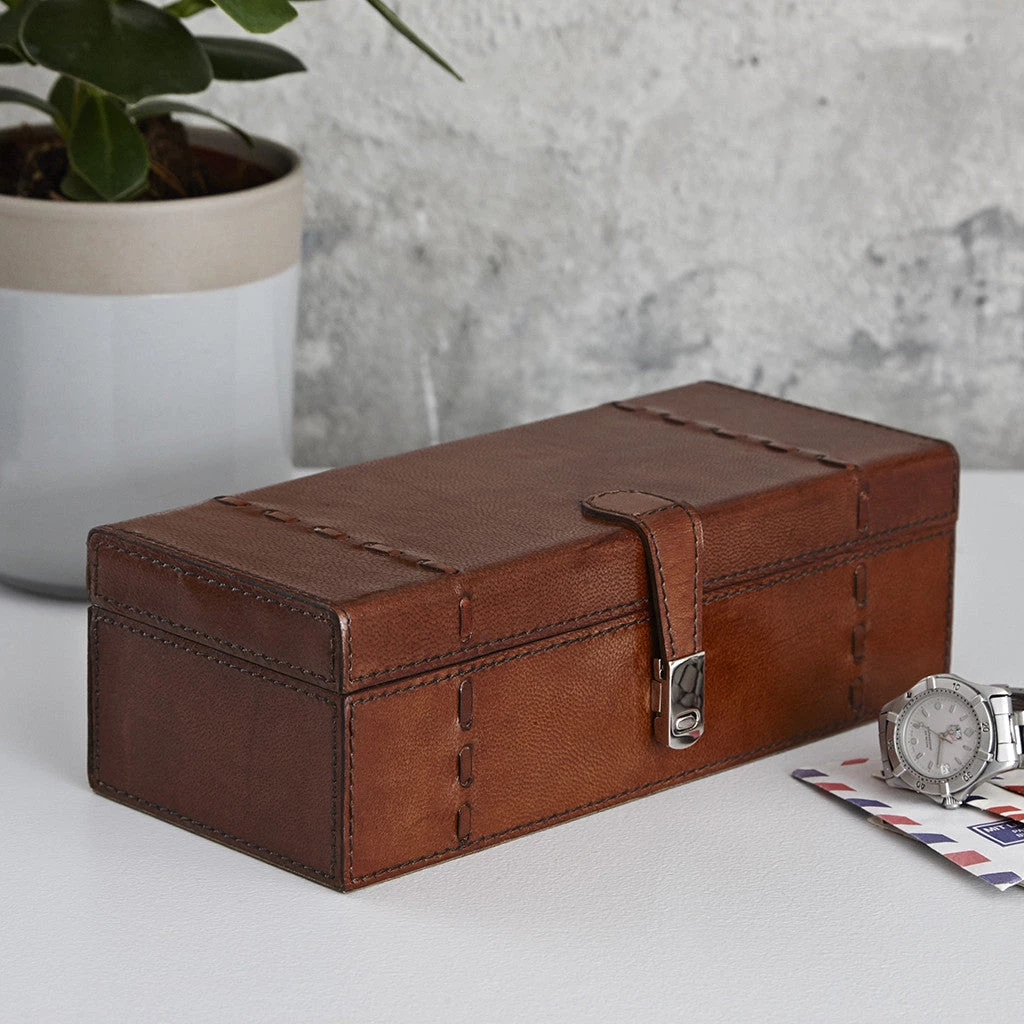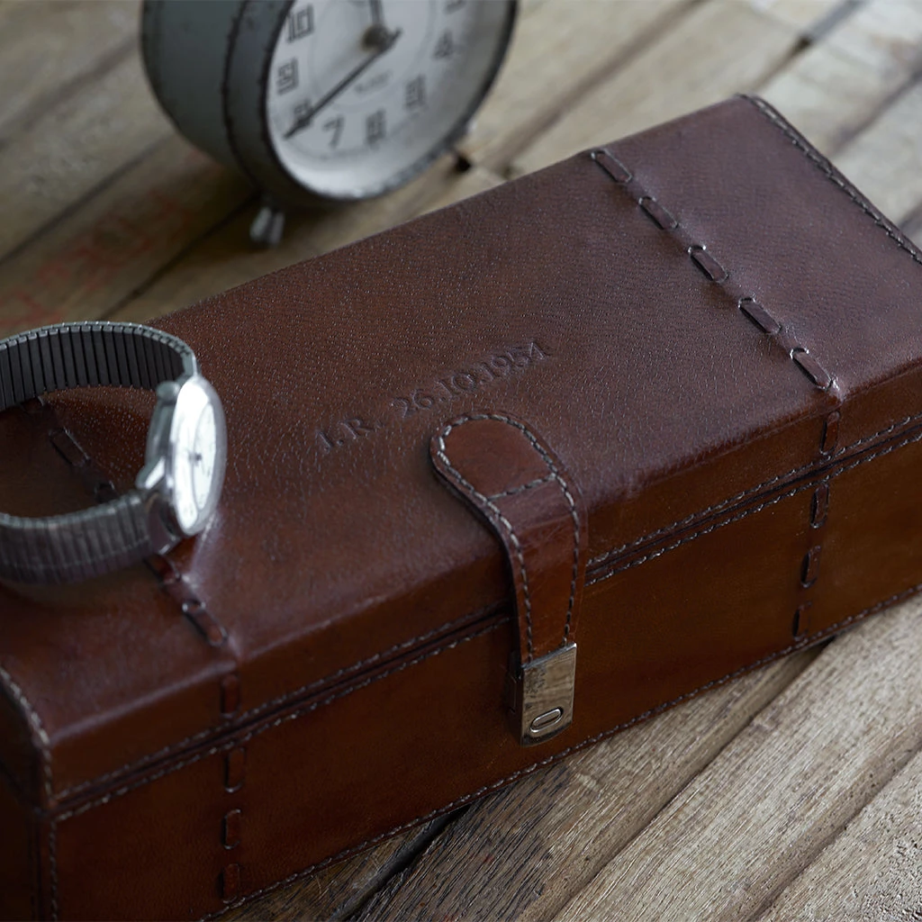 A smart leather watch box for the safe storage, and/or presentation of, three watches in separate compartments. To create a memorable gift, we can hand emboss a date, initials or your choice of a message above the clasp on the top of the box.