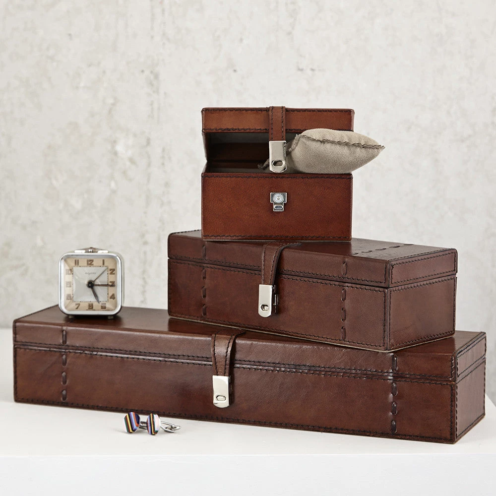 Our leather watch box with a chrome clasp is a generous size for one watch.  Add a handful of cufflinks, some collar stiffeners, and your shirt studs and it becomes an indispensable piece in your dressing area. A gorgeous gift with many uses.