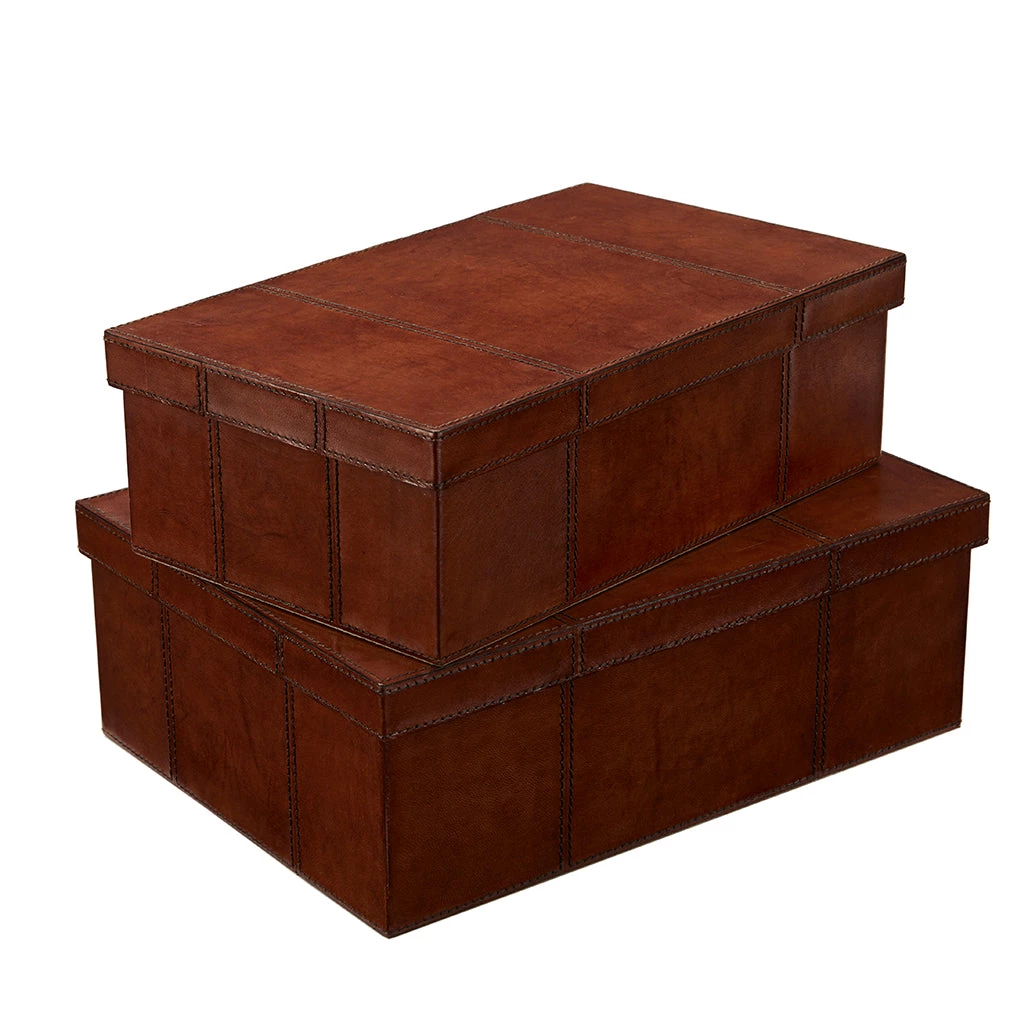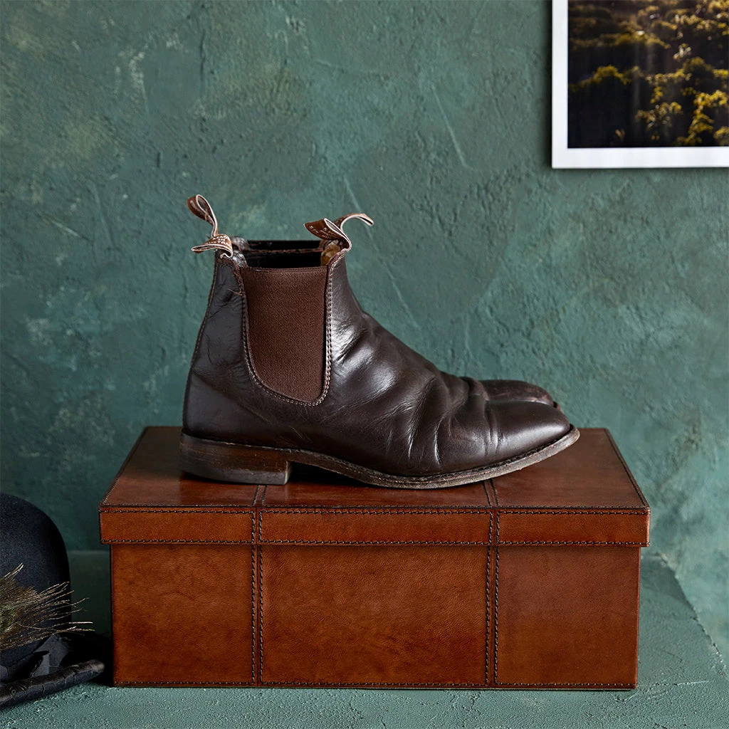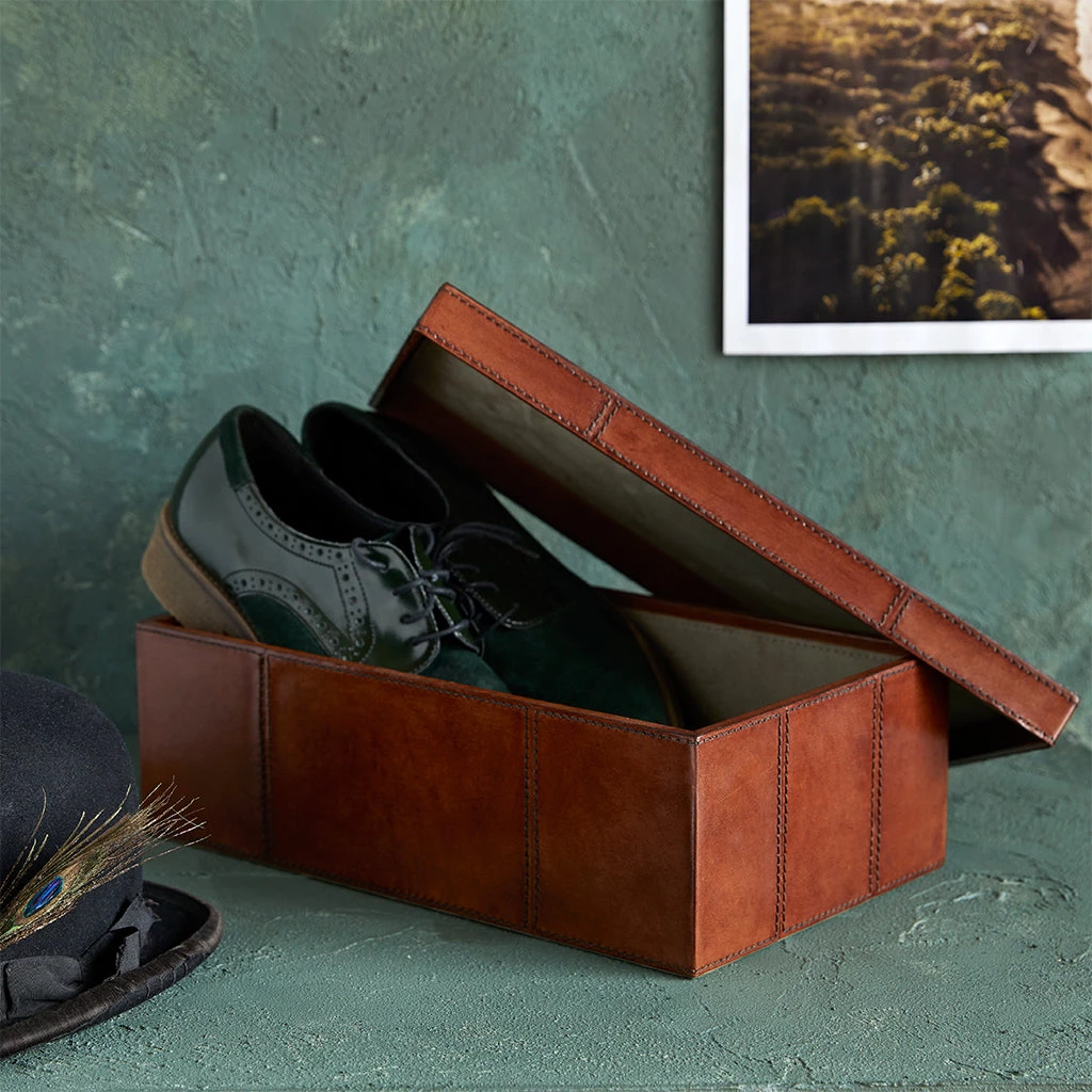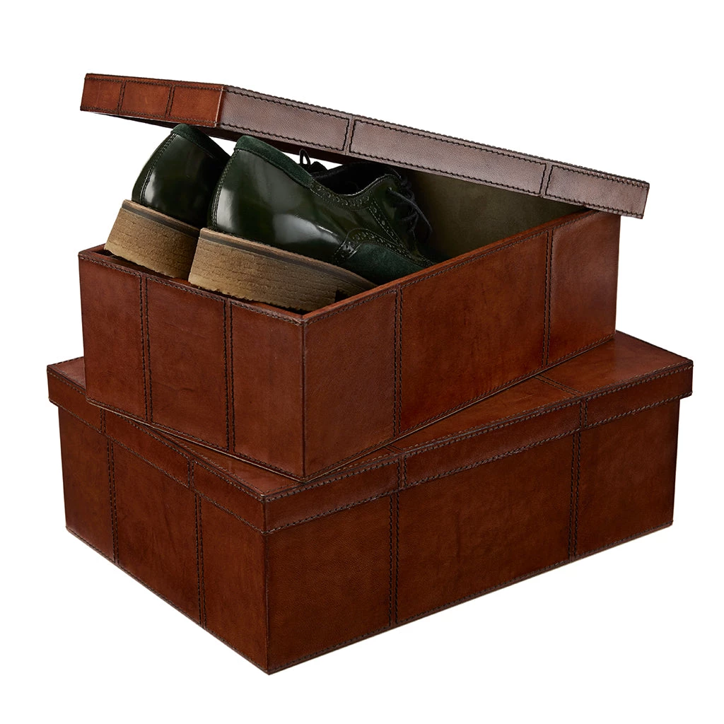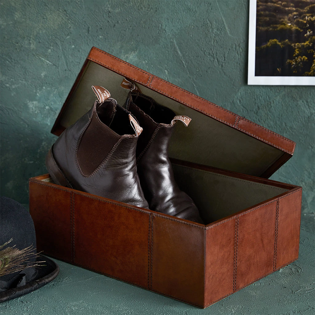 A leather shoe storage box designed to fit ladies shoes up to size 7 and mens shoes up to size 11. Lots of other things can be stored in the boxes, photos, letters, tv remotes, haberdashery, jewellery.