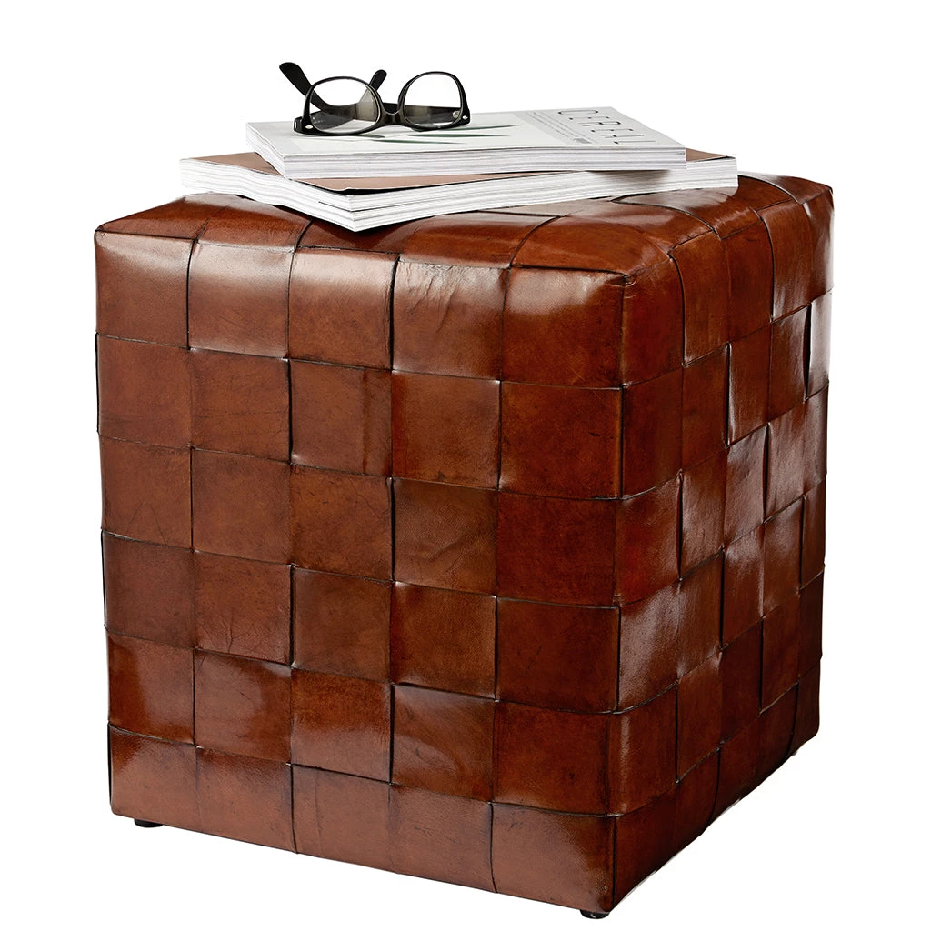A stunning leather ottoman covered in wide woven strips of leather. A fabulous addition to any interior space. Stylish and contemporary, the pouffe is practical and adds texture and interest to a room. The leather ottoman can be used as a footstool and works well as an occasional seat. Cool in a teenager’s den, children’s playroom or chill out zone.Â