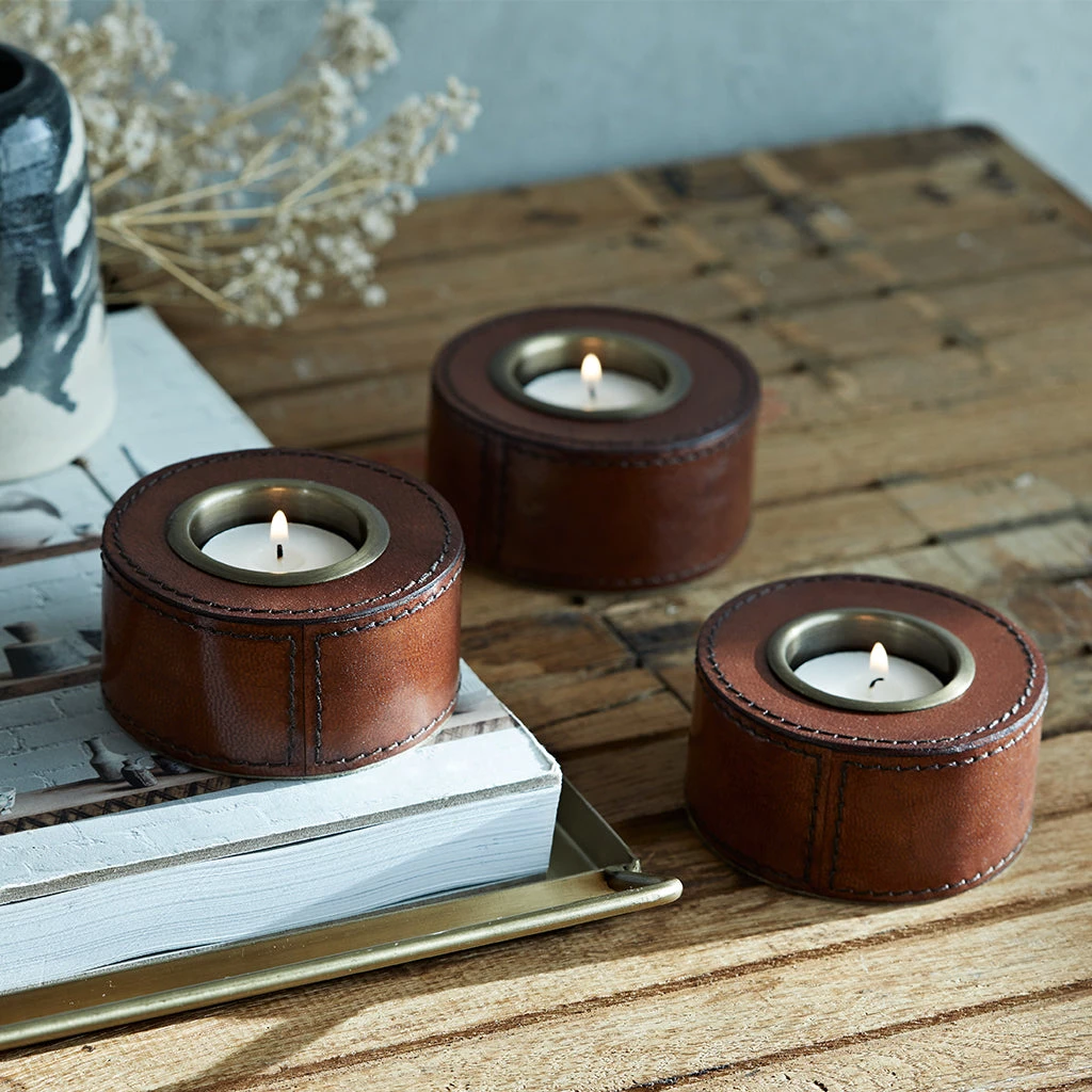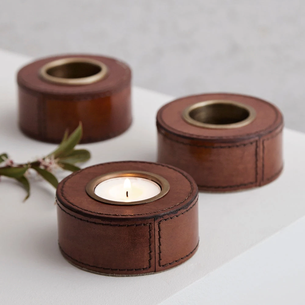 A set of three leather tealight holders with removable brass insert, a great accessory to pair up with our leather mats and coasters to style up your home.