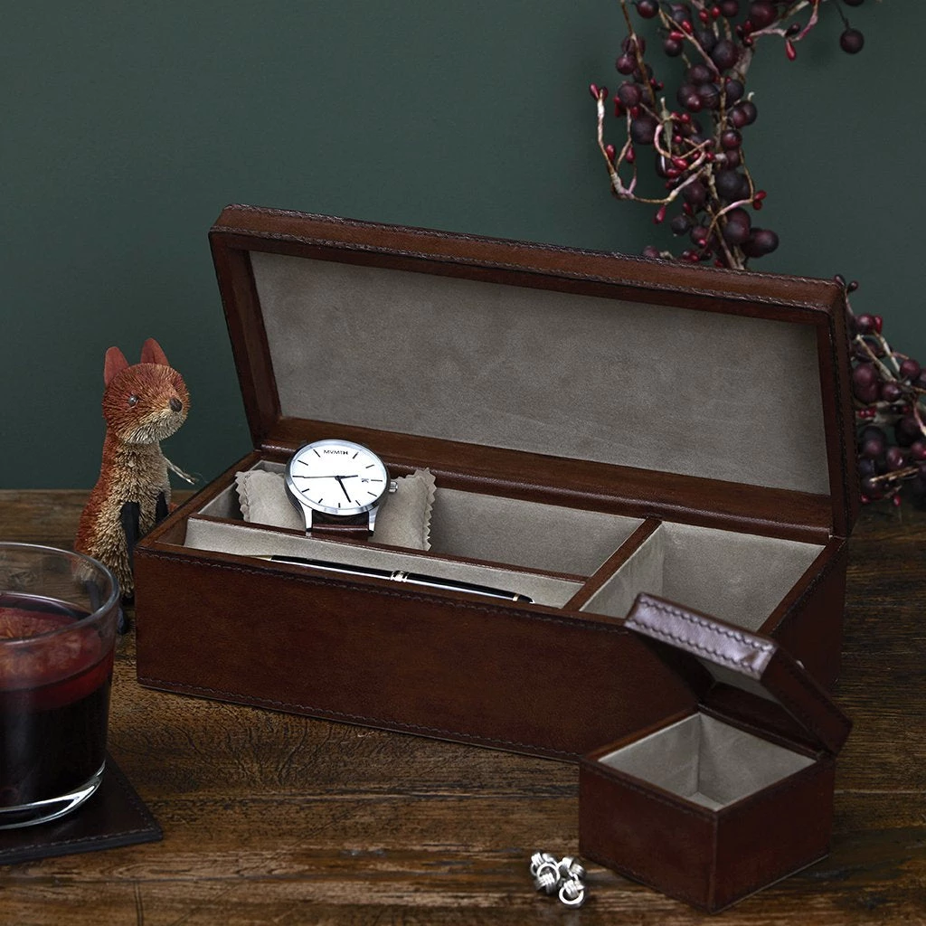 A distinguished leather men’s accessories box. A wonderful leather stash box for a gentleman’s dressing table. Remove the watch cushions and it sits equally well on a writing desk.
