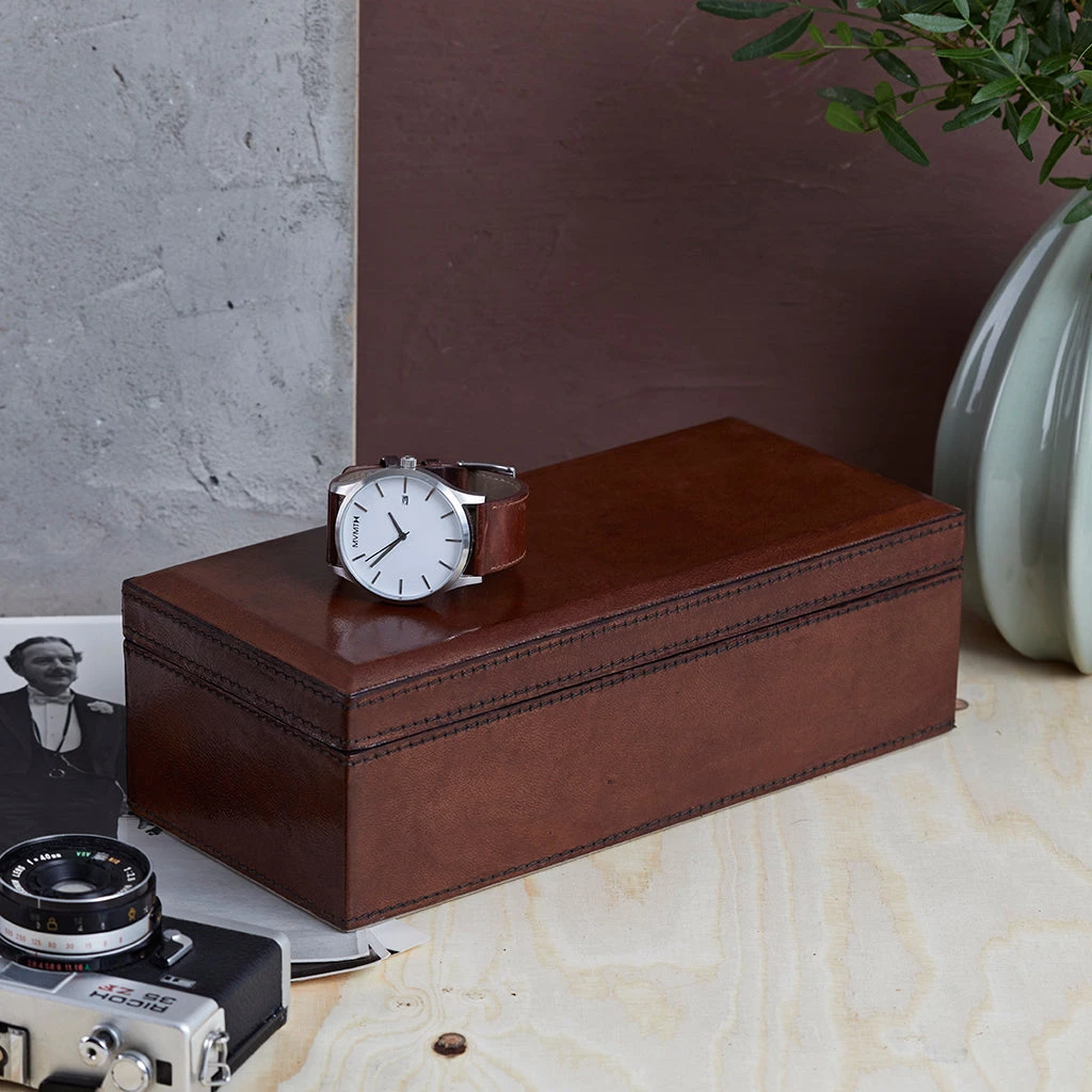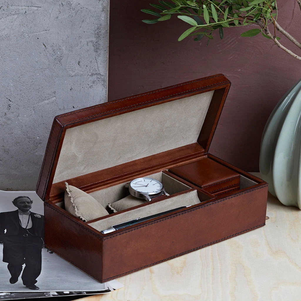 The box has space to hold a pen, two watches around the watch cushions and the optional removable leather square box designed for travel. Without the small box, the bigger section is useful to fill with jewellery, collar stiffeners or desk bits such as paper clips if the role of desk tidy is used. The lid is softly bevelled and has an internal magnet to keep it shut.