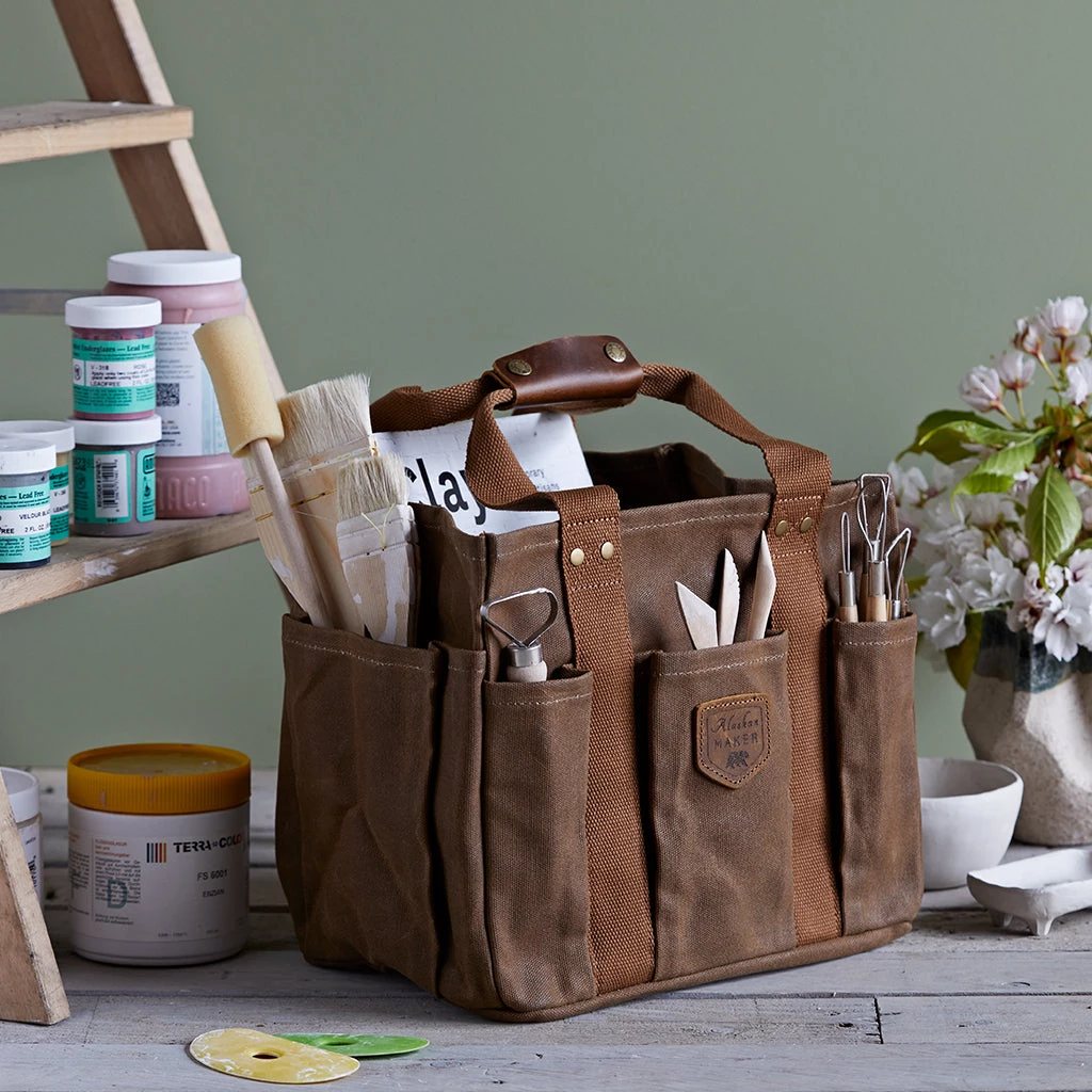 A robust waterproof waxed canvas and leather hobbies bag. A perfect gift for a craft enthusiast. With eight pockets for tools and craft accessories, it is the perfect companion whether in the design studio, on the kitchen table or stocking up in the potting shed. Fill with brushes and tools.